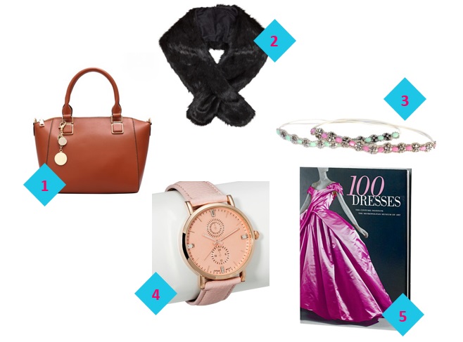 1 – Brown Ring Embellished Zipper PU Bag | 2 – DAVILA faux-fur shawl | 3 – Silver Stones Headband * | 4 – Pink Strap Watch with Rose Gold Bezel | 5 – 100 Dresses Coffee Table Book