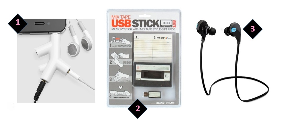 1 – Branch Earphone Splitter | 2 – Mix Tape 1GB USB | 3 – Mpow Swift 2nd-Gen Bluetooth 4.0 Wireless Sports Headphones Running Exercise Sweatproof Headsets