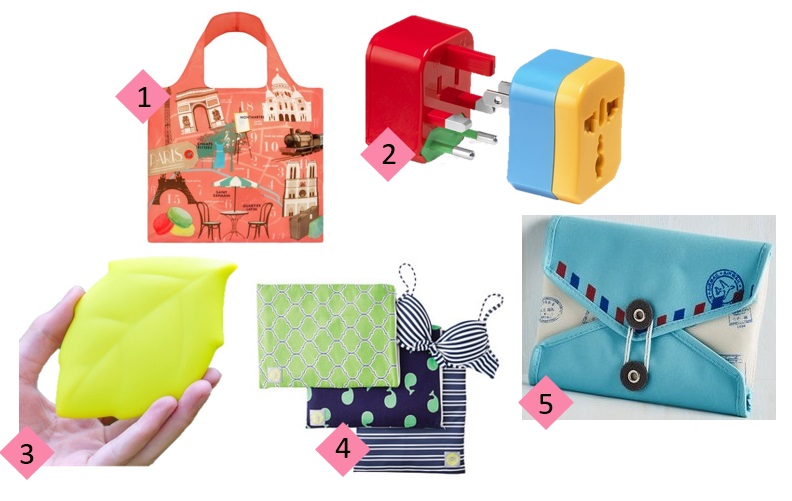 1 – Paris Print Reusable Tote in Matching Pouch | 2 – 4-In-1 Travel Adapter | 3 – Leaf Pocket Cup | 4 – Travel Happens Wet Bag | 5 – Send It Your Way Jewelry Organizer