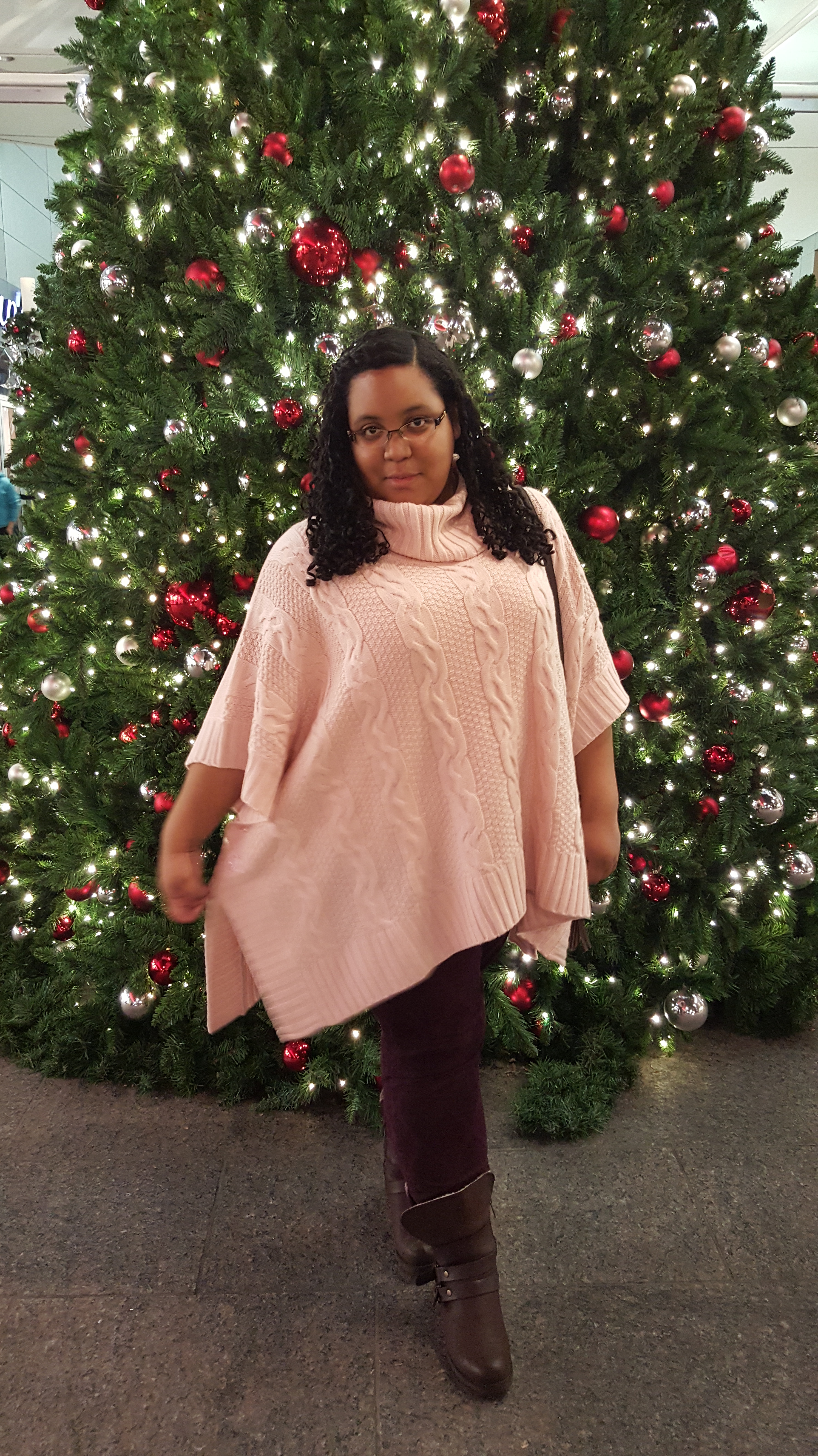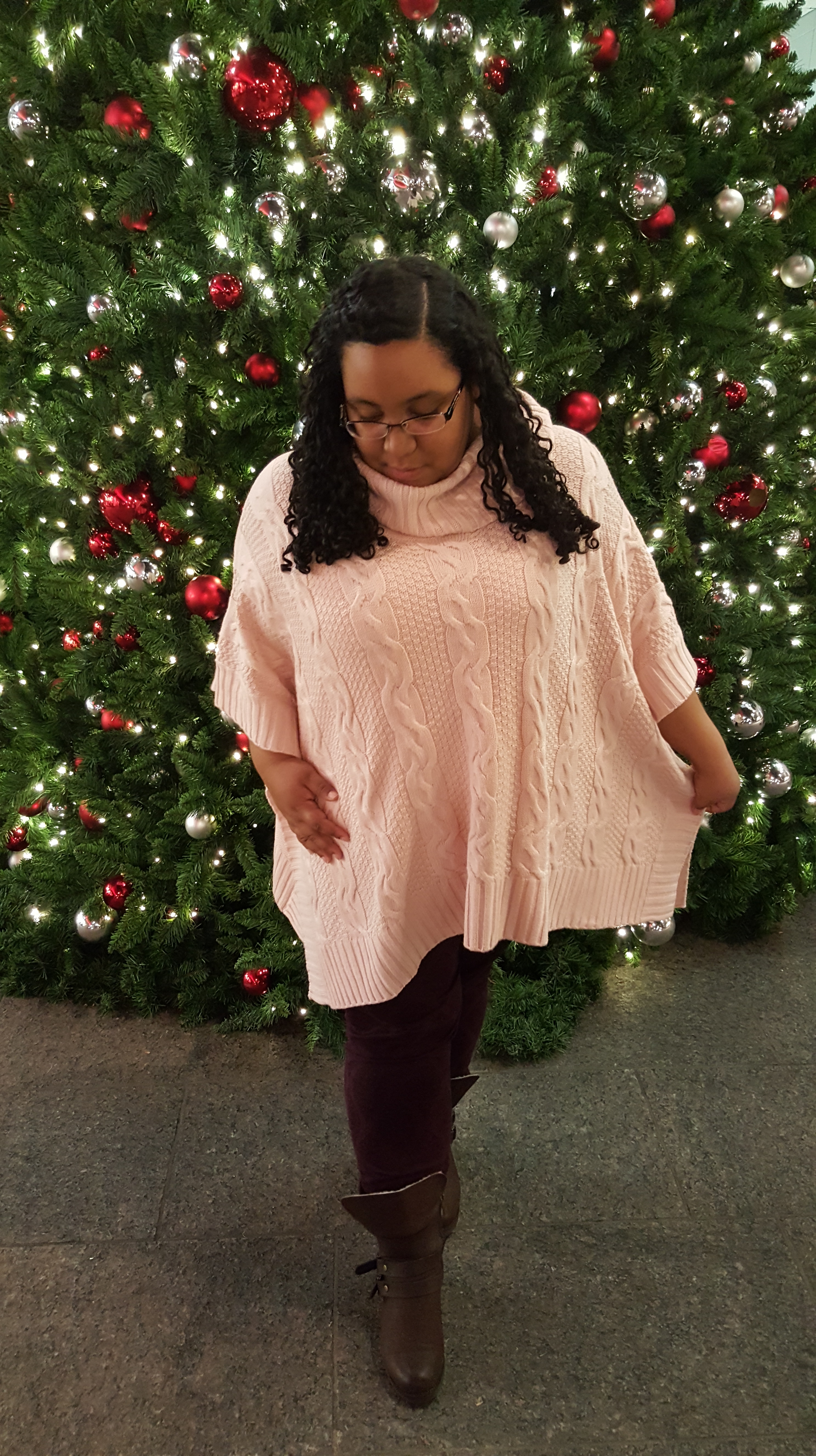 Of the gifts I received this Christmas my favorite has to be this cable knit poncho. The cherry blossom pink collaborated well with the plum of my medallion jeans that I got this fall at the Big Fat Flea. While it is a bit big on my petite frame, that is all part of the over-sized style. It is comfy, warm and loose, perfect for a casual day or night out during the holidays. This has been the welcome addition to my winter wardrobe this year as NYC has been mildly chilly lately making a heavy coat unnecessary. The brown Windsor boots from Avenue completed this laid back look by adding the right amount of edge to an overall soft feminine chic outfit. Who says comfort can’t be in style?