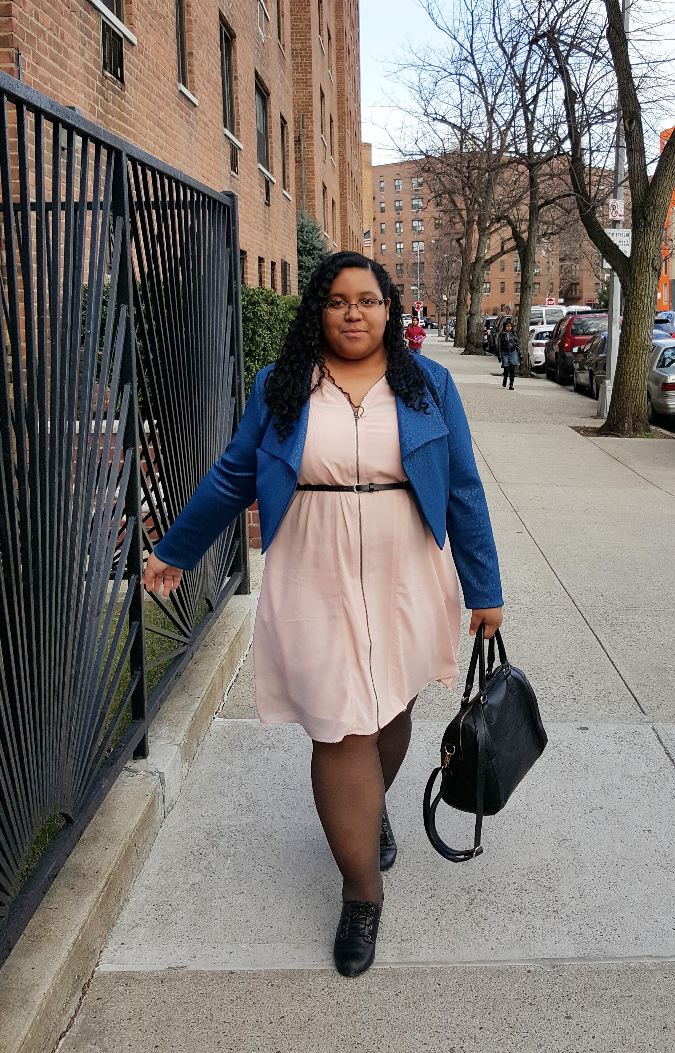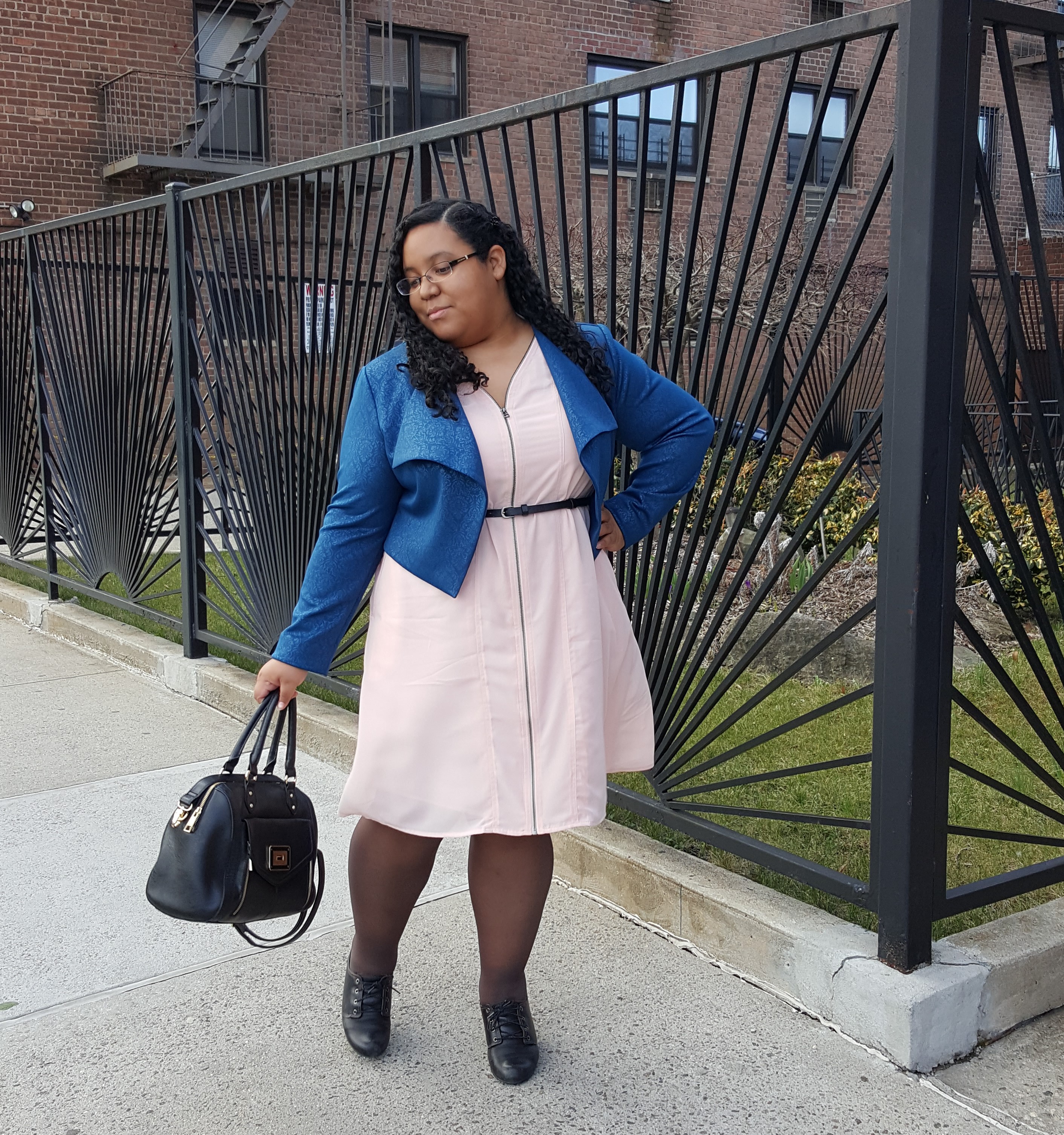 The Georgette dress is edgy with the v-neck zip front yet sweet and feminine due to the blush color. I tend to say far away from blush tones because I find that it is too close to my skin tone and has a tendency of paling me out (forgive the pun) which is why I included hints of black in the outfit with my Aldo bowler bag, and favorite lace front oxford heels. I should note that the dress is lined and has side-seam pockets. It also comes with its own self-tie belt but I decided to use a black skinny belt instead to balance the look.