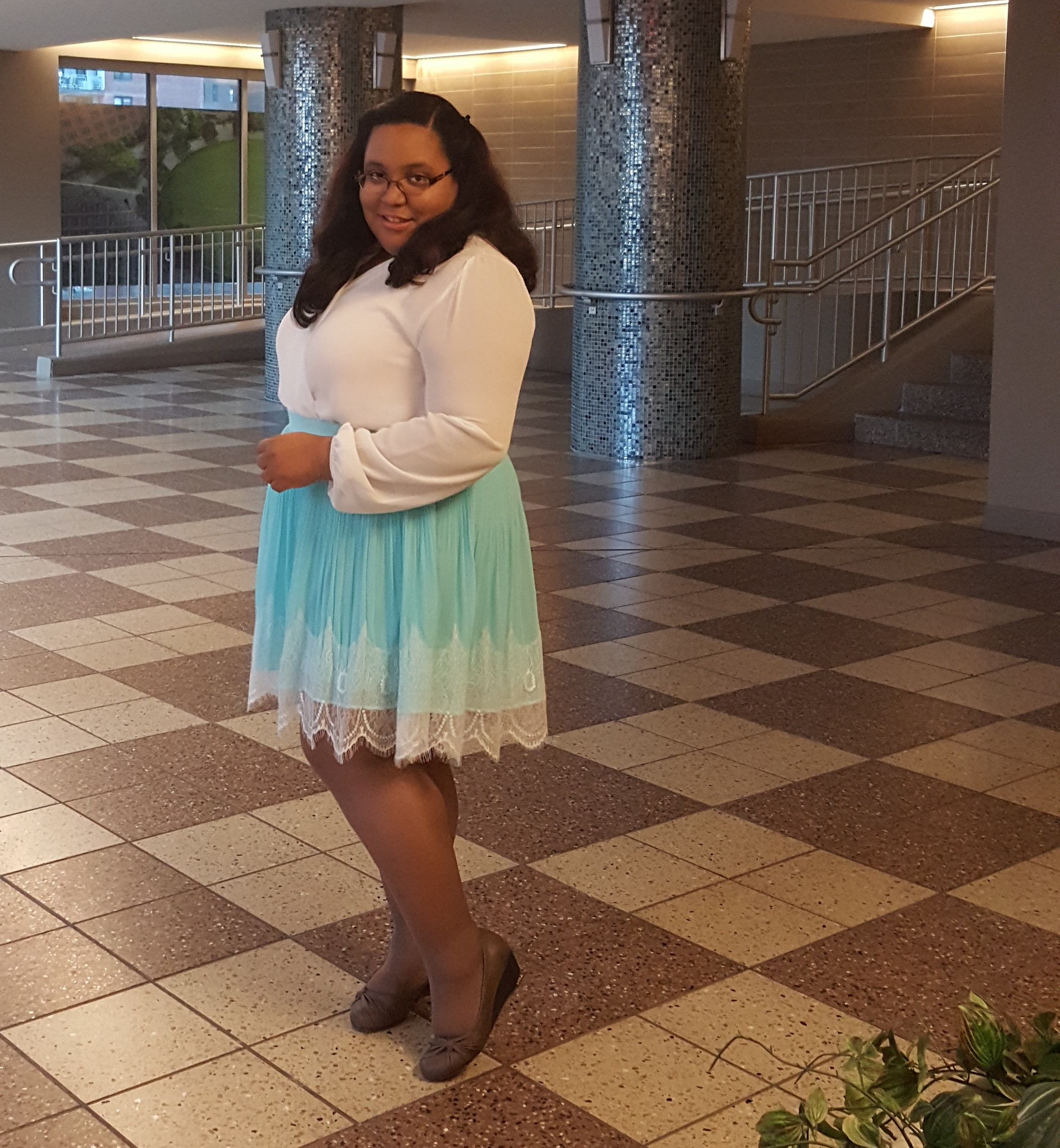 We’ve officially made it to December and that means its time for  holiday parties and gatherings. As someone who has a natural aversion to sequins (which tends to be very popular this time of year), I’m always looking for alternative holiday fashion. For the most part that means occasionally stepping out of the familiar seasonal fashion color spectrum of red, green, black and gold. For this look I shopped my closet for a blouse that would go well with this chiffon pleated skirt from Torrid that I managed to buy back in October for only $6! Even though both of these pieces are from spring collections, the ivory and turquoise palate simply said winter snow to me. 20161203_160731-2