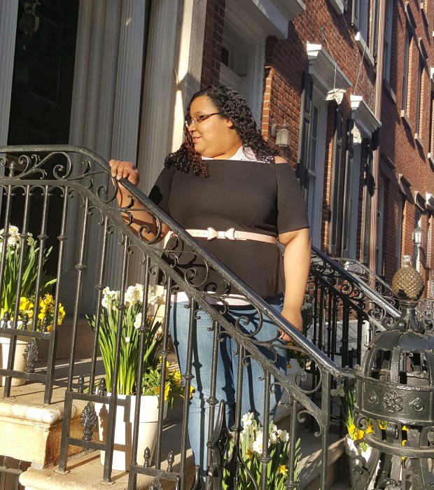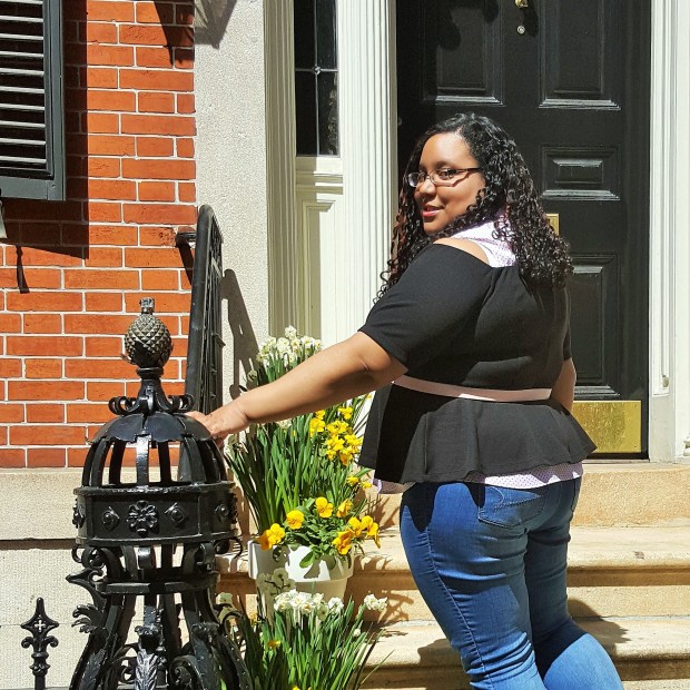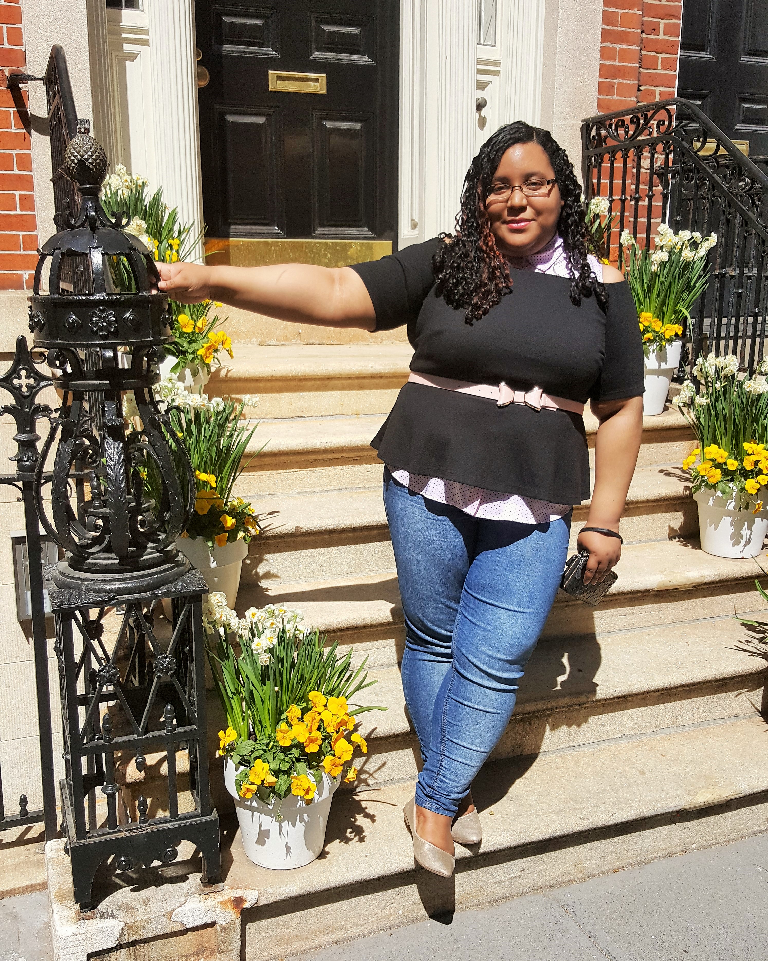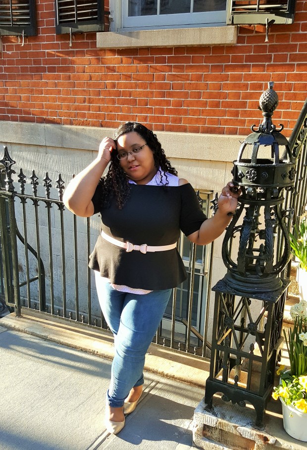 For this look I swapped my traditional black blazer for a quirky off the shoulder peplum top, a statement separate that adds a playful feminine touch to this outfit. Paired with my sleeveless polka-dot blouse I just love how it created the subtle cold shoulder that is both work appropriate and fun. This look came together with some gold accents from the buttons on the blouse, to the detail on the bow belt and these metallic pointed flats that I recently purchased for $10 from Kohl’s. These flats were the best choice for traveling into the city for work as they are so comfortable to the point that they feel like I’m wearing slippers. It was hard not to smile in this look so I am very happy I took a chance and tried something new.