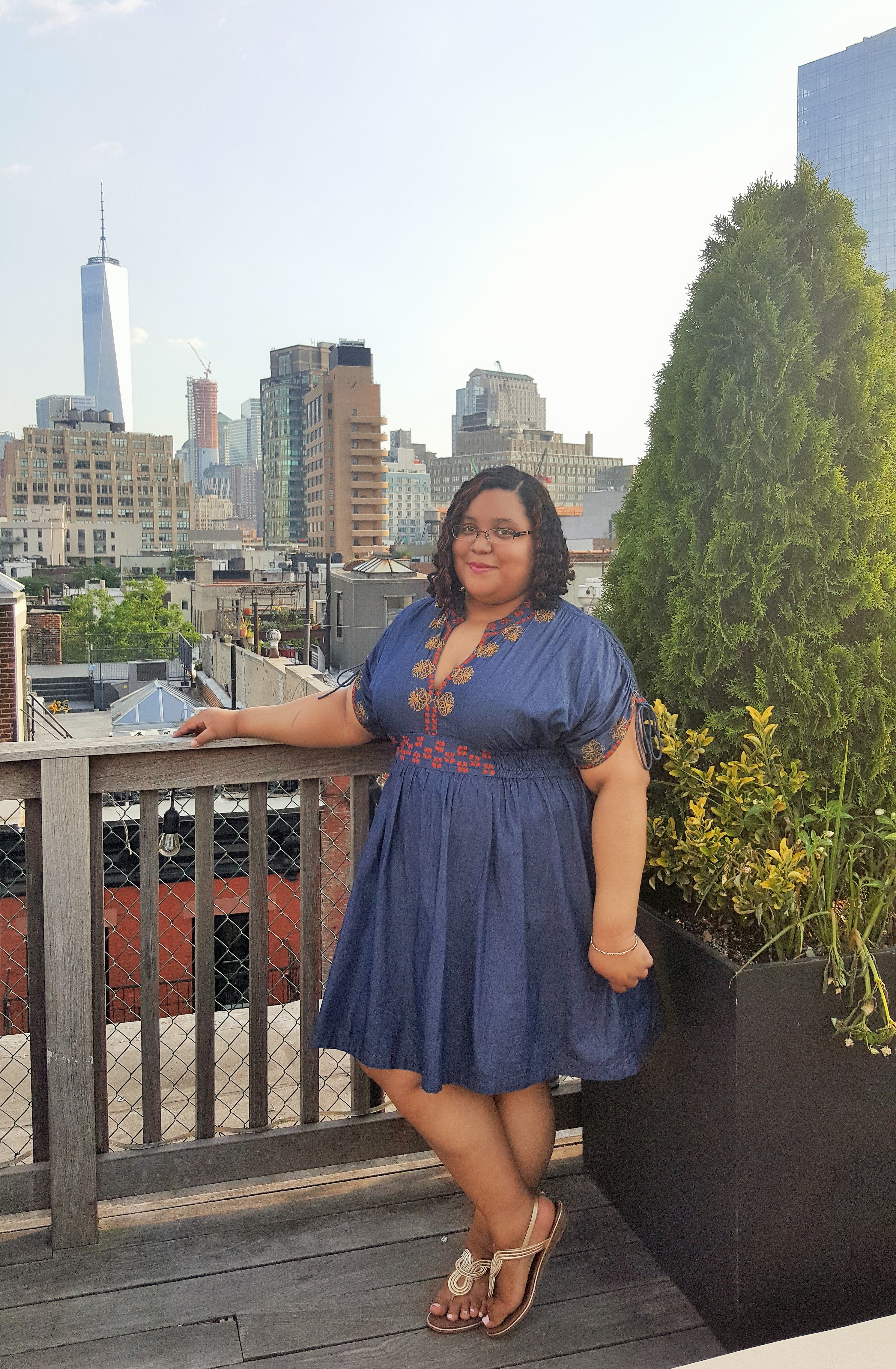 For my outfit this evening I went for one of my favorite dresses from the “blogger vault,” this boho-inspired chambray dress. This piece is actually one I bought as a 25 year birthday present to myself three years ago from Eshakti. Although this dress is sold on their site as a maxi, I had it custom made to my measurements and preferences. With the graphic embellishment at the mandarin collar on the low V-neck, cuffs and empire waist this is a statement dress that can be dressed up or down for practically any occasion you may have. I completed the look by adding some metallic accents with bangles and my favorite Avenue sandals from last summer.