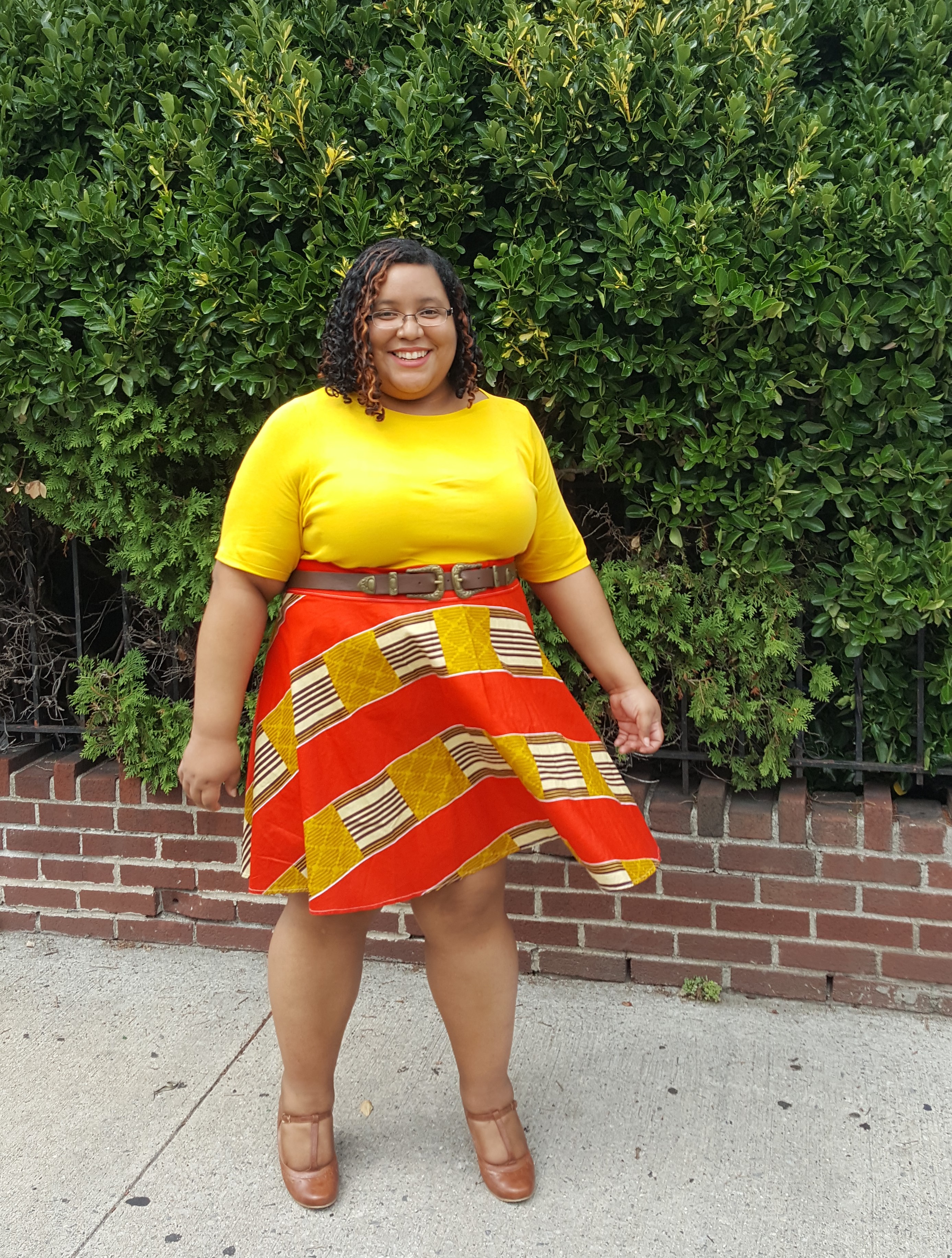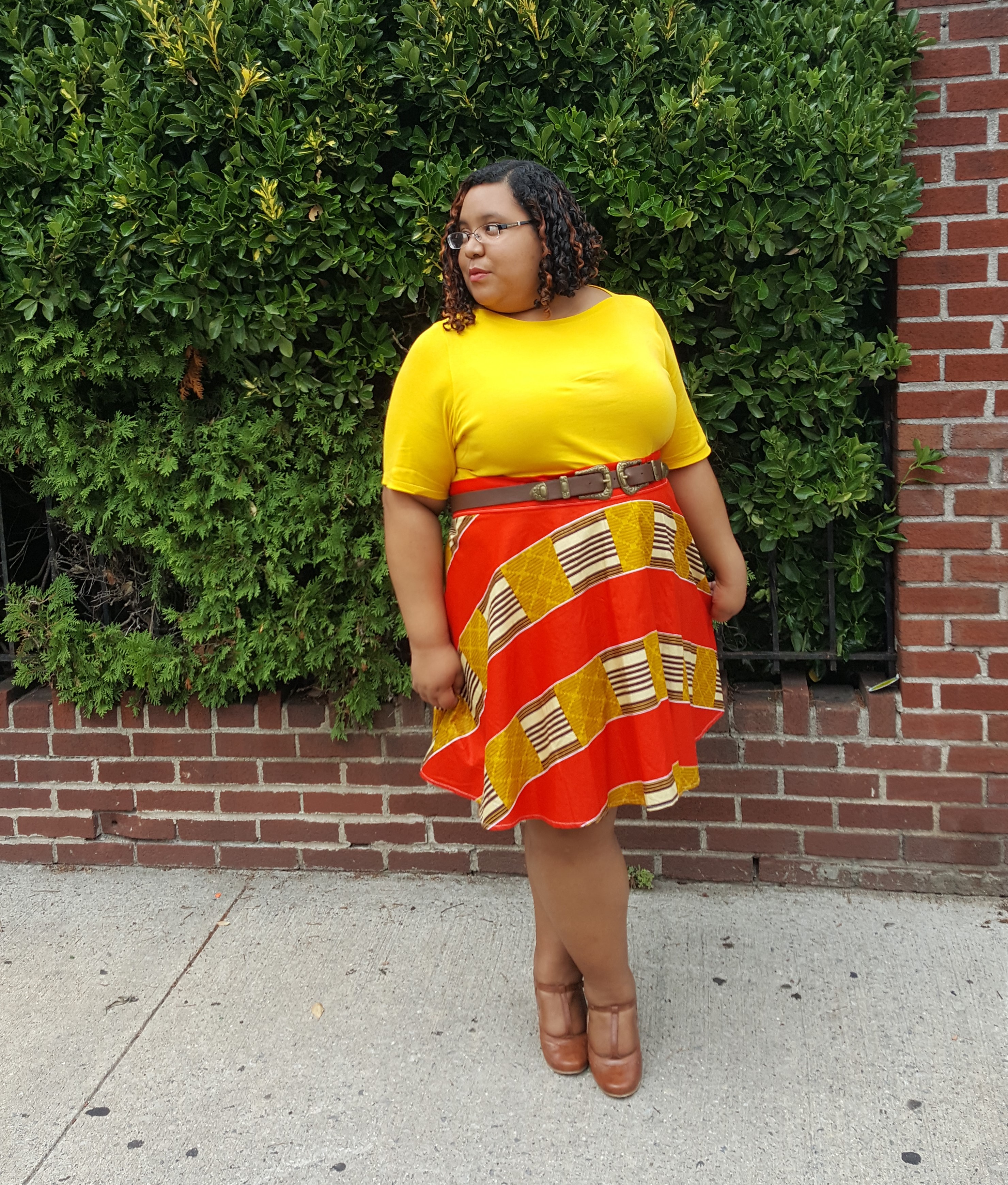 I got this skirt at the Curvy Expo during Full Figured Fashion Week this past June from the Obioma fashion booth and I was so excited about this new statement piece that I wore it a little more than two weeks after. I remember the face of my best friend when I descended the stairs to meet her and her hubby at her car to head over to Brooklyn for Curl Fest. They both were stunned to not only see me forgo black but to go for something so bright. I’m still not used to getting compliments but I think I can get used to being greeted with, “You look gorgeous.”