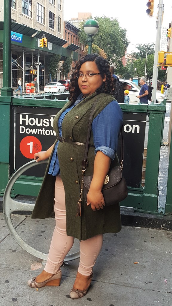For many of my colleagues, jeans, blouse and flats are they way to go. So to shake things up a bit I went for some colored denim. Blush was the hue for summer this year yet it can still be dressed for fall with the right accents, like this ivy green military inspired long duster sweater vest. It provides some light laying for the fall chill with visual interest from the bronze button detail.