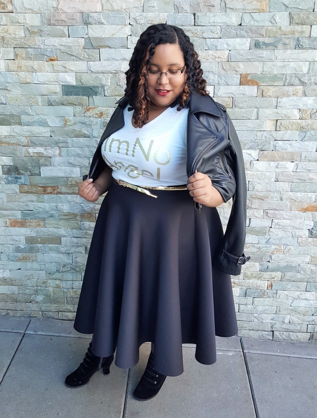 Because of the gold text of this graphic tee, my mind immediately went to styling a dressy look so I paired tee with this scuba midi skirt that I recently got from shopping Jonquel’s closet. (More on that coming soon.) It’s structured and flared silhouette is very much like the skater skirts I love to wear, however, the length really elevates the look. While I wanted to keep the I decided to mix textures with my velvet faux button booties, a subtle nod to my art historian, and cropped faux leather jacket. The look came together with the addition of a gold skinny belt, choker and bold burgundy red lips.