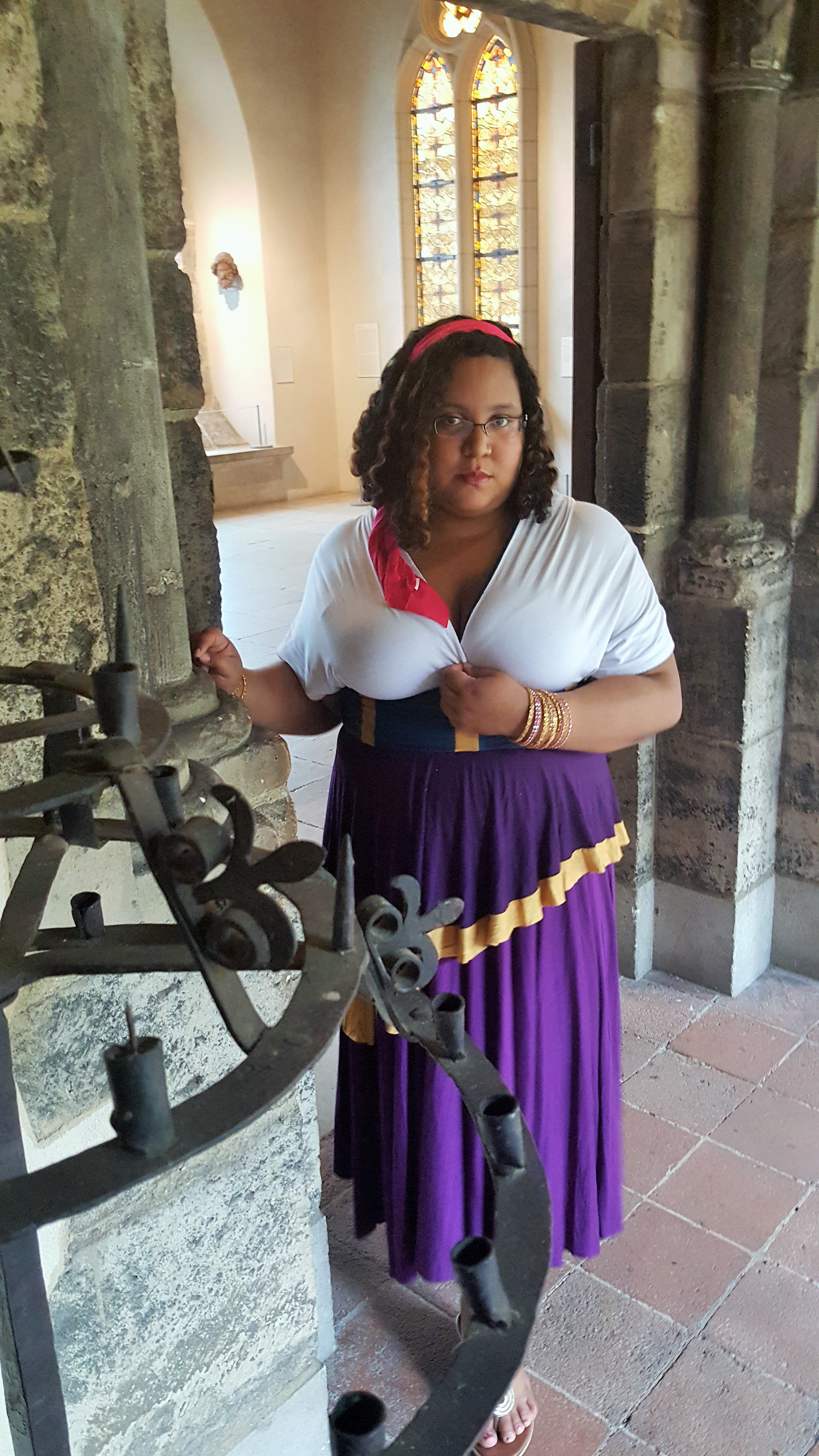 Esmeralda’s style is pretty easy to replicate – peasant blouse, blue corset with thin gold stripes, a purple skirt and of course, gold accents in the form of bangles, hoop earrings and coin trim on the scarf tied at her hip. Yet it is just so much easier to have it all be in one piece and it is so comfortable too. Once my dress was completed, Danielle was kind enough to cut a piece of pink cloth for me to tie on my head so I only added bangles that I borrowed from my mother’s costume jewelry box and gold sandals. (In the film Esmeralda is barefoot, yet gold sandals just seems like the kind of thing she would add to her wardrobe given the amount of gold accents she already wears.)