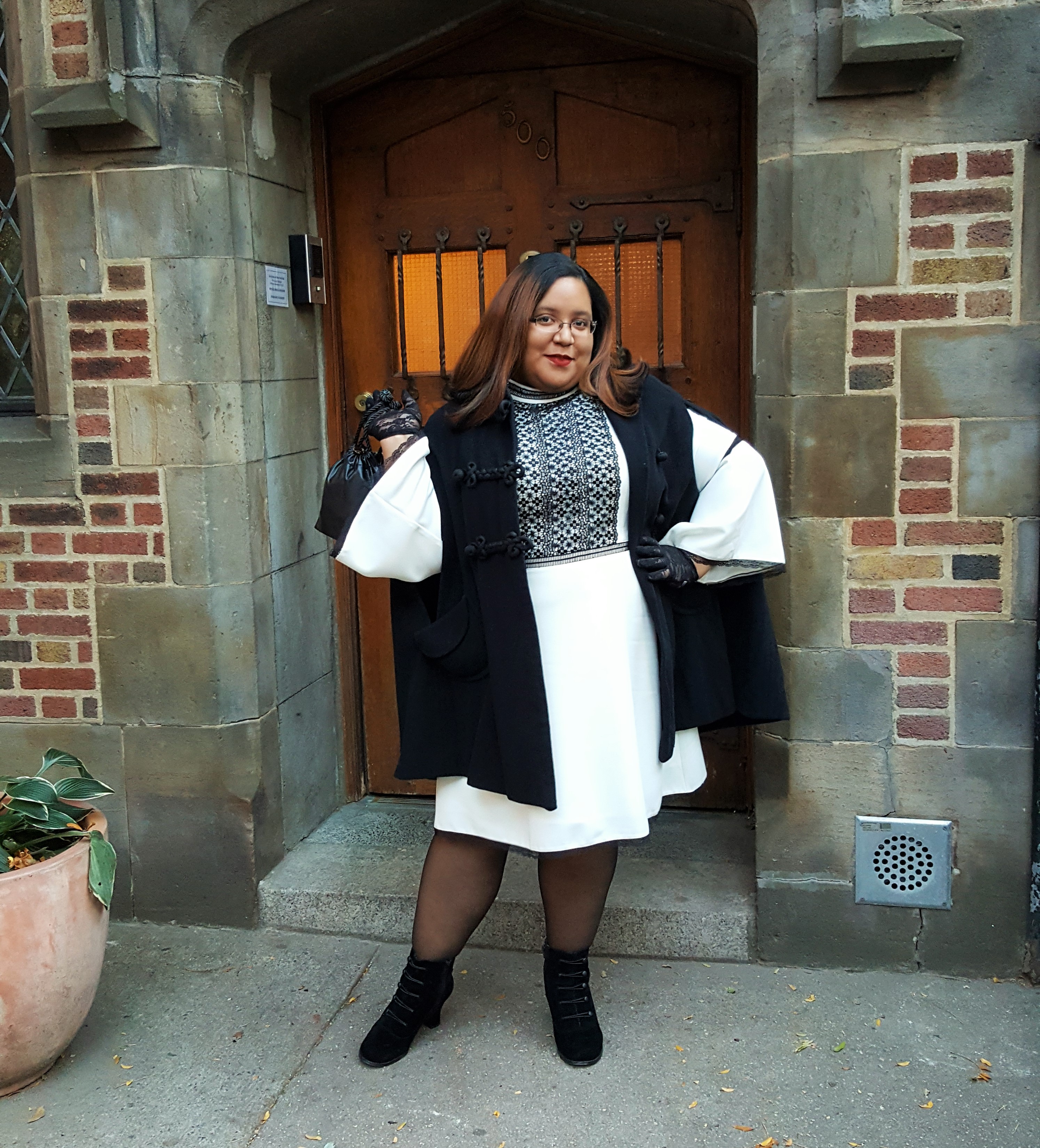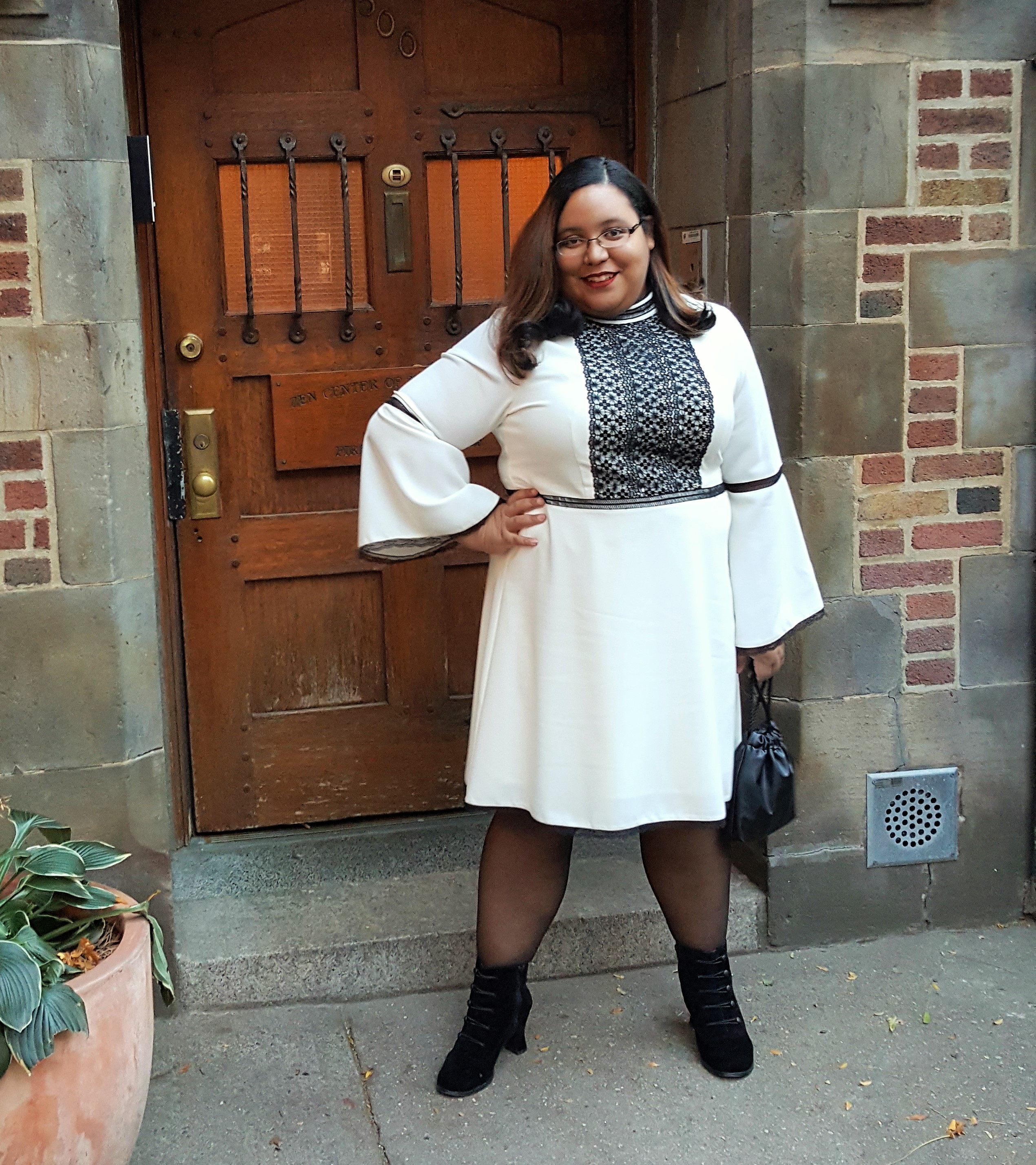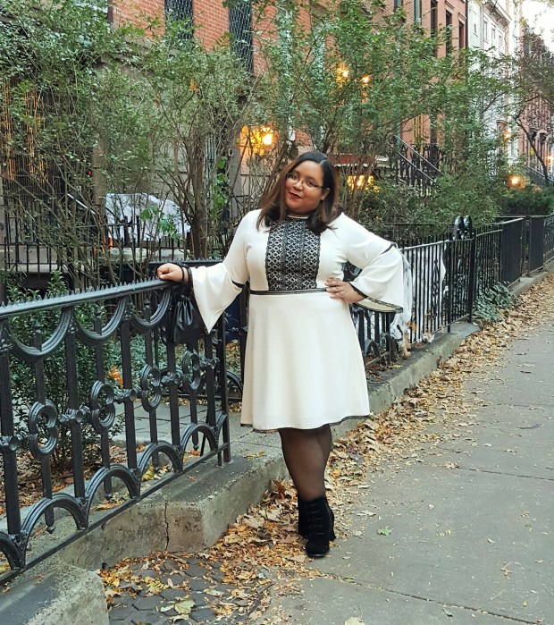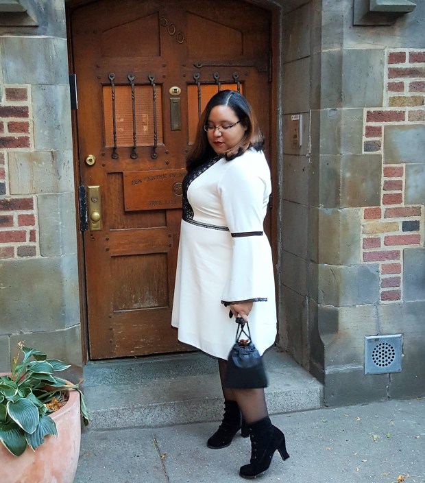 As one of the authors of the anthology, I knew I would be expected to attend the conference so back in the summer I had already made plans for an outfit to the point that just needed to find the right shoes for it. However a little less than a week before the event, I was asked by my editor and the 4RWI team to wear white, which worried me because I can literally count on one hand the amount of white items in my closet. With no time to shop I put in my request for my Dia box and got this lovely dress from the new Nanette by Nanette Lepore collection. This Dia&Co. exclusive collection was featured at theCURVYcon runway show this year and consists of dresses, skirts, tops, and bottoms in sizes 14 to 24. If you check out the fall offerings from the collection on the Dia&Co website, you’ll notice that the styles are chic and feminine having ruffles, velvet, and lace in bold colors that would would work well for those holiday parties that are coming up soon. The prices of the collection is a bit on the high end with prices ranges from $69 and up, but each of the items would be welcome splurges as they are all classic pieces that can be styled in different ways for any special occasion.