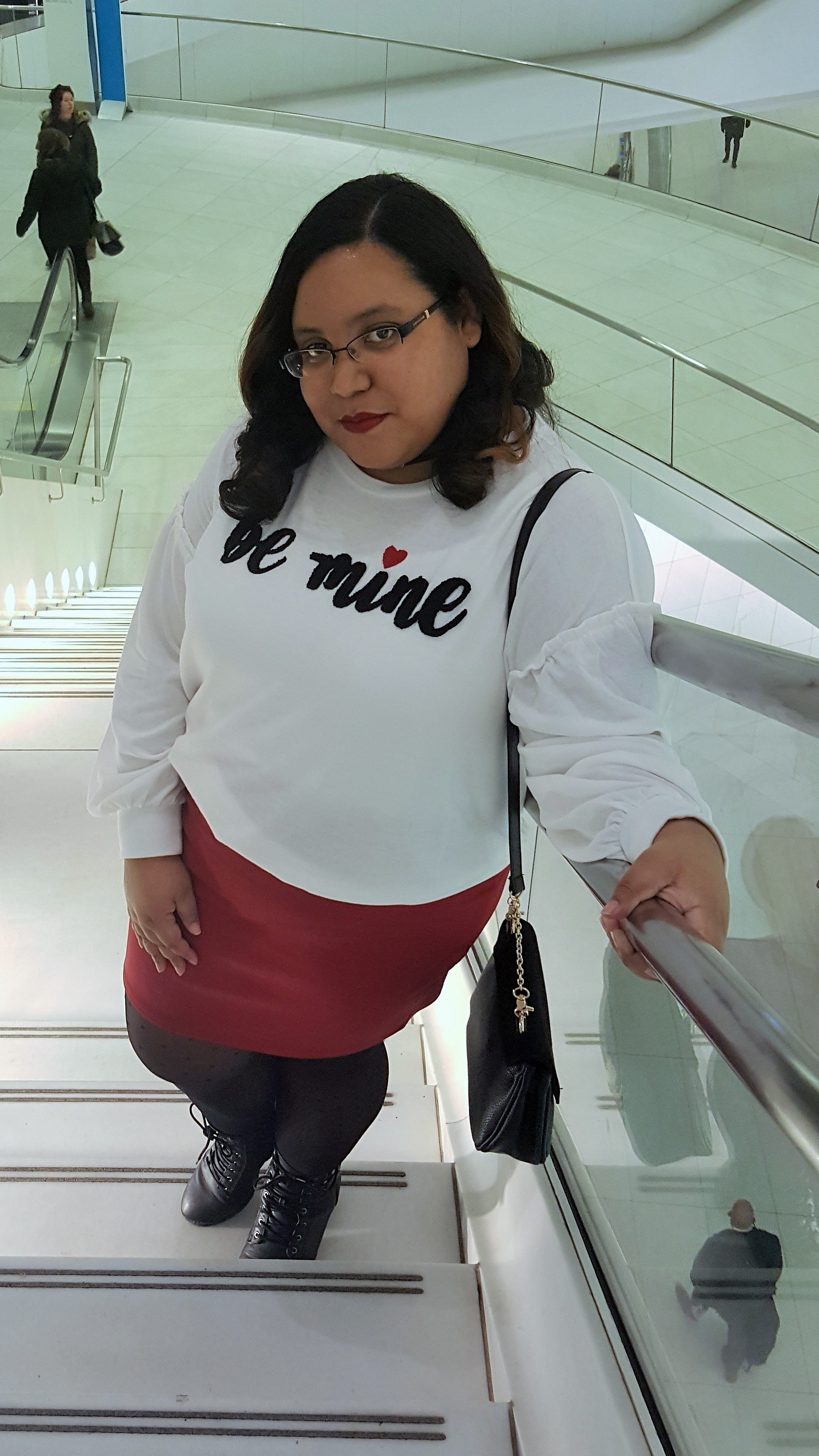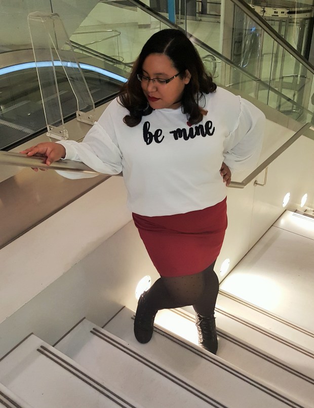I tucked the front in this curve-hugging scuba knit skirt thatI managed to snag for less than $20! The skirt is actually the shortest I currently own which is a MAJOR step out of my comfort zone. I’ve been constantly berated for even showing a hint of thigh by my family members because they believe that they should be more toned if they are going to be “displayed.” I decided to show them off in these pin dot tights to add some sophisticated edge to this look. I’m definitely looking forward to any V-day specific casual outings that may come my way this year.