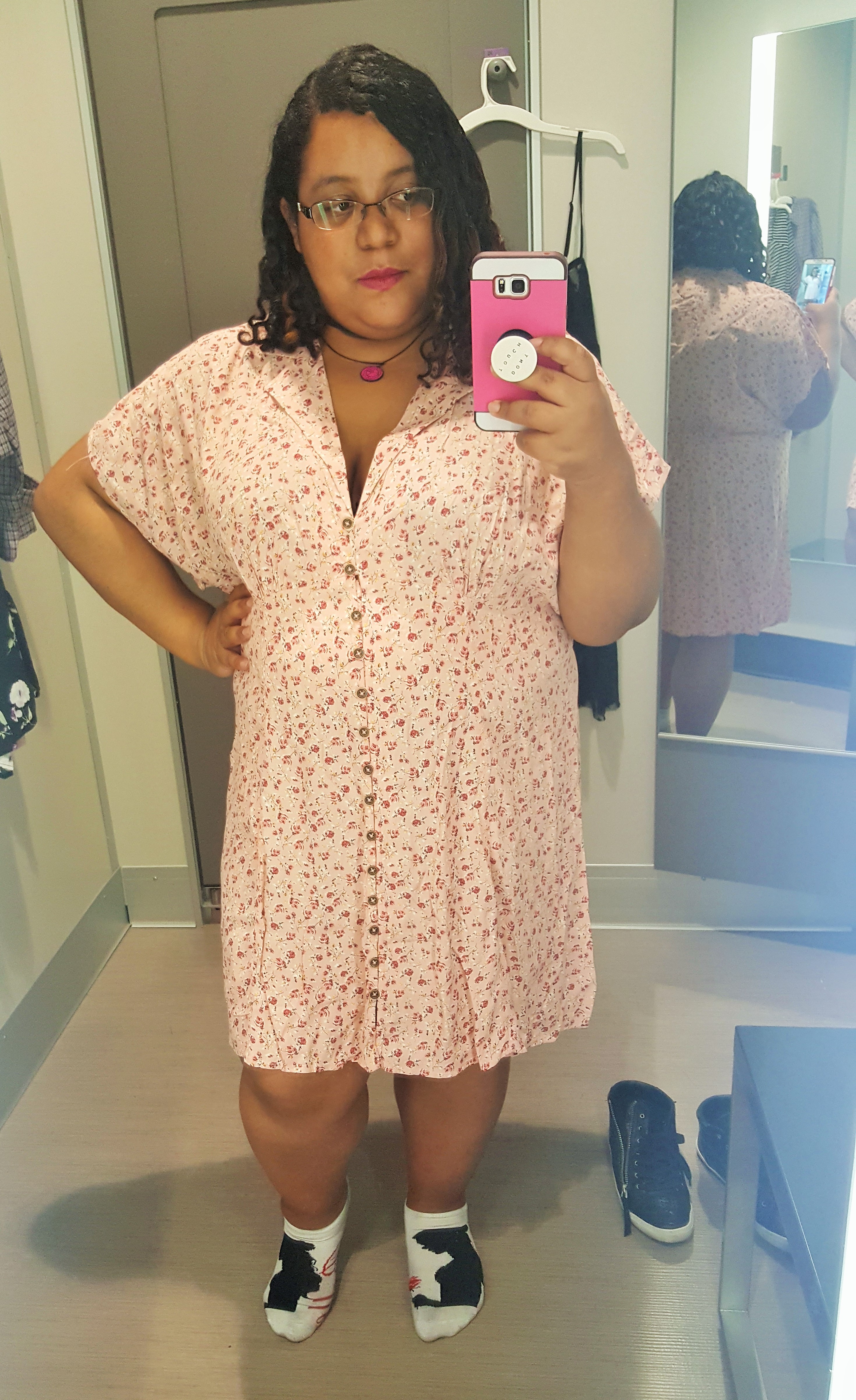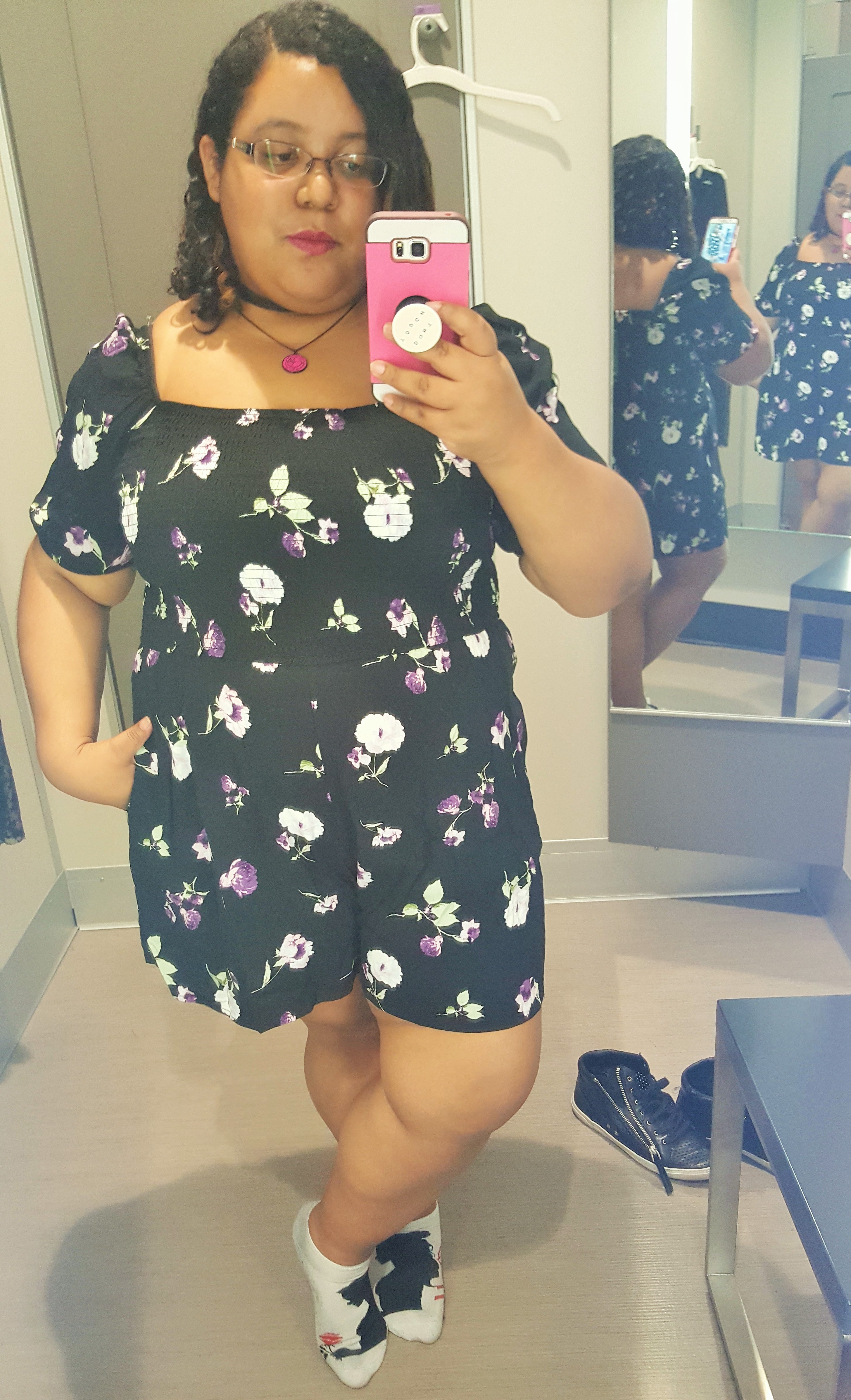 I LOVE this romper! For one thing the material is light so it can be worn in this hot and humid summer weather we have been having. I’ve heard rumors that the plus size version of this romper does not have pockets like the straight size does but I’m hoping that is just hearsay. Because of the smocked top and the roomy short bottom I do suggest sizing down for a better fit.