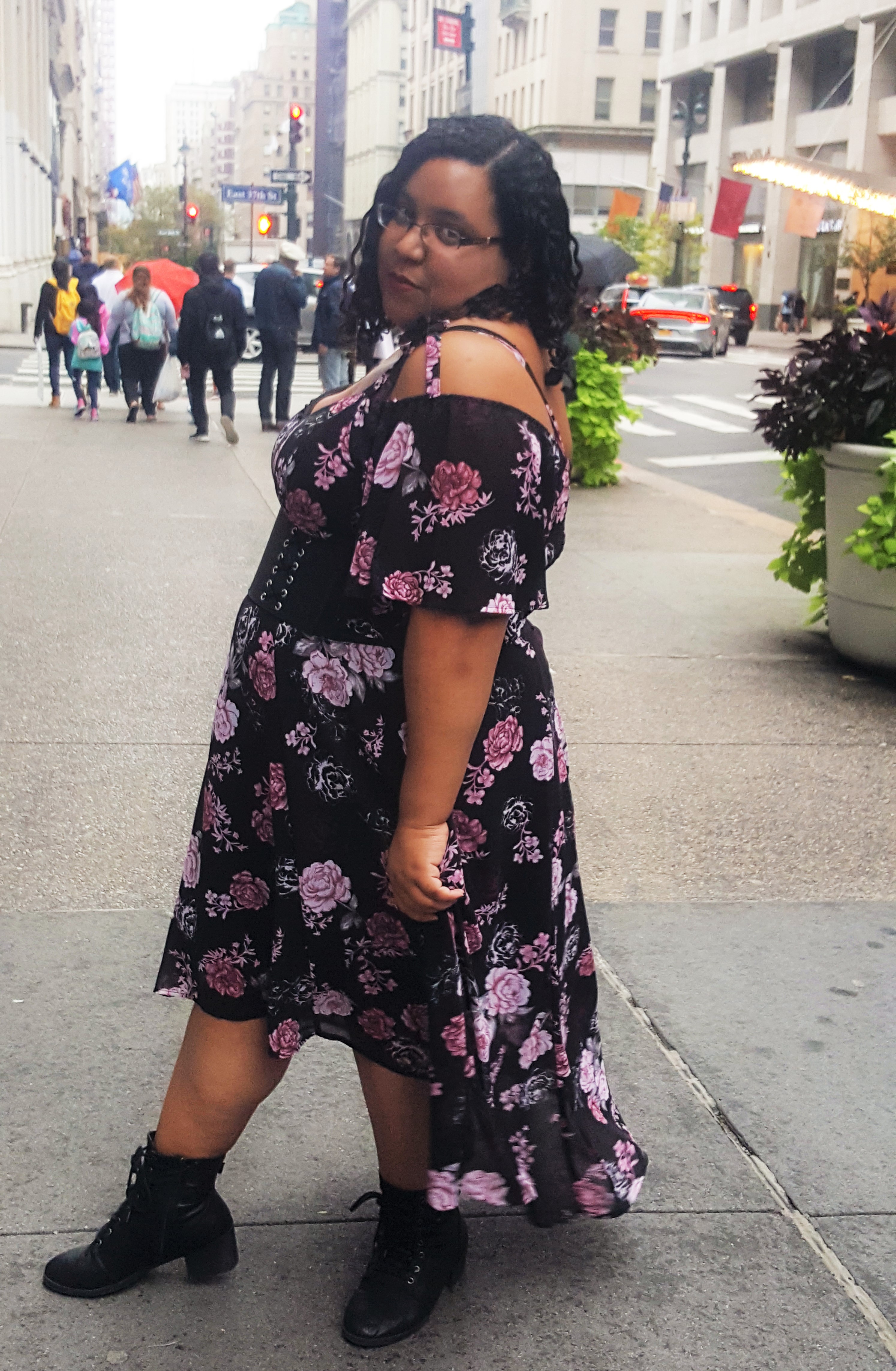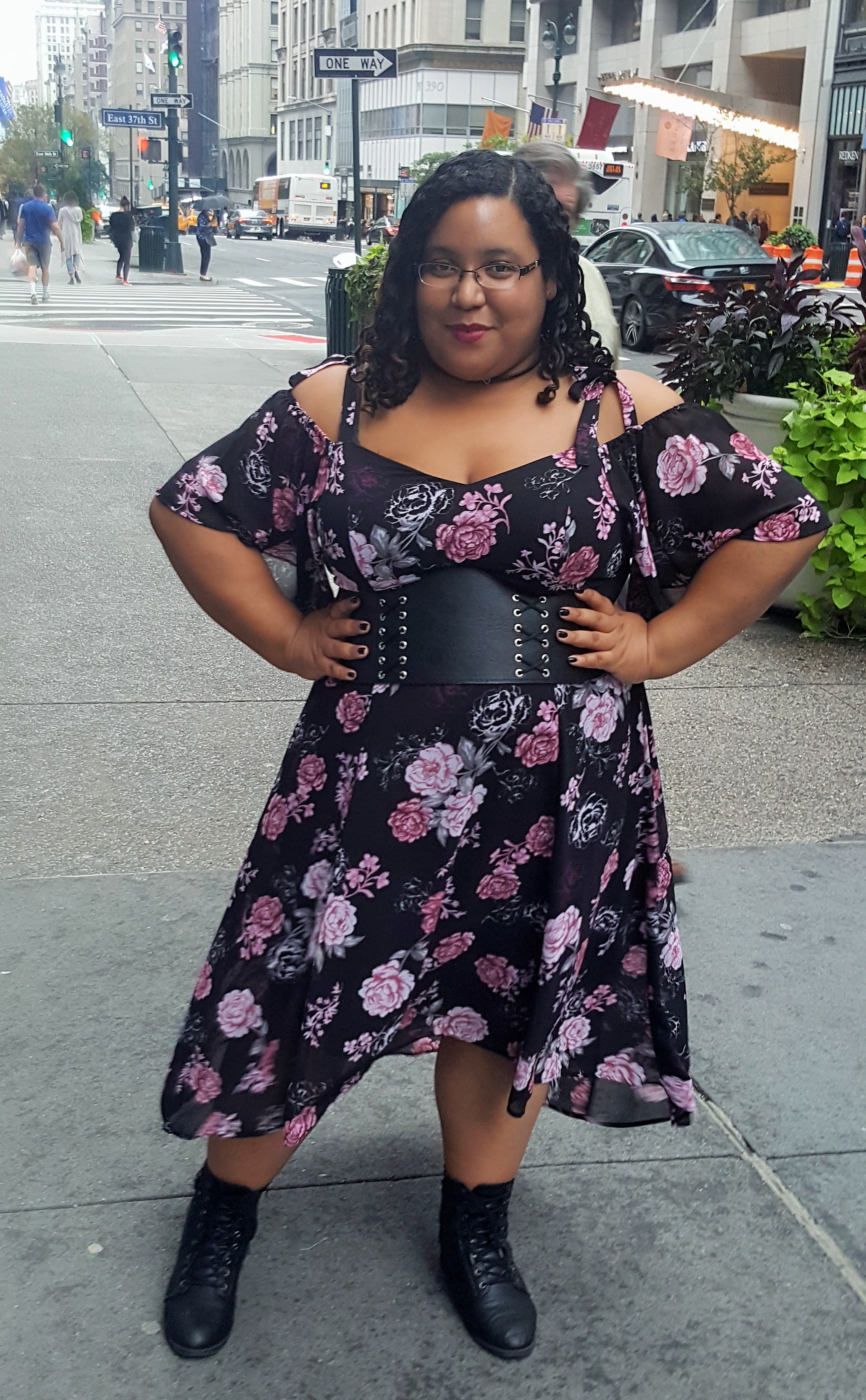 As for me, I guess you could say that my style theme for the weekend was “ultra violet edgy glam.” Having gone for a more casual look the day before, I decided for something more feminine this time around though still comfortable in the footwear department, because let’s face it, commuter life is hard. Anyway, I paired this Torrid floral chiffon hi-lo dress with heeled booties so that the back train wouldn’t drag too much as I walked (#petiteplusproblems). The addition of the corset belt was actually a last minute decision I made as I walked out the door that morning and I’m glad I included it since it really pulled the look together. I got a lot of compliments for this look even by some Torrid representatives that were attending the event who immediately recognized my dress as one of theirs!