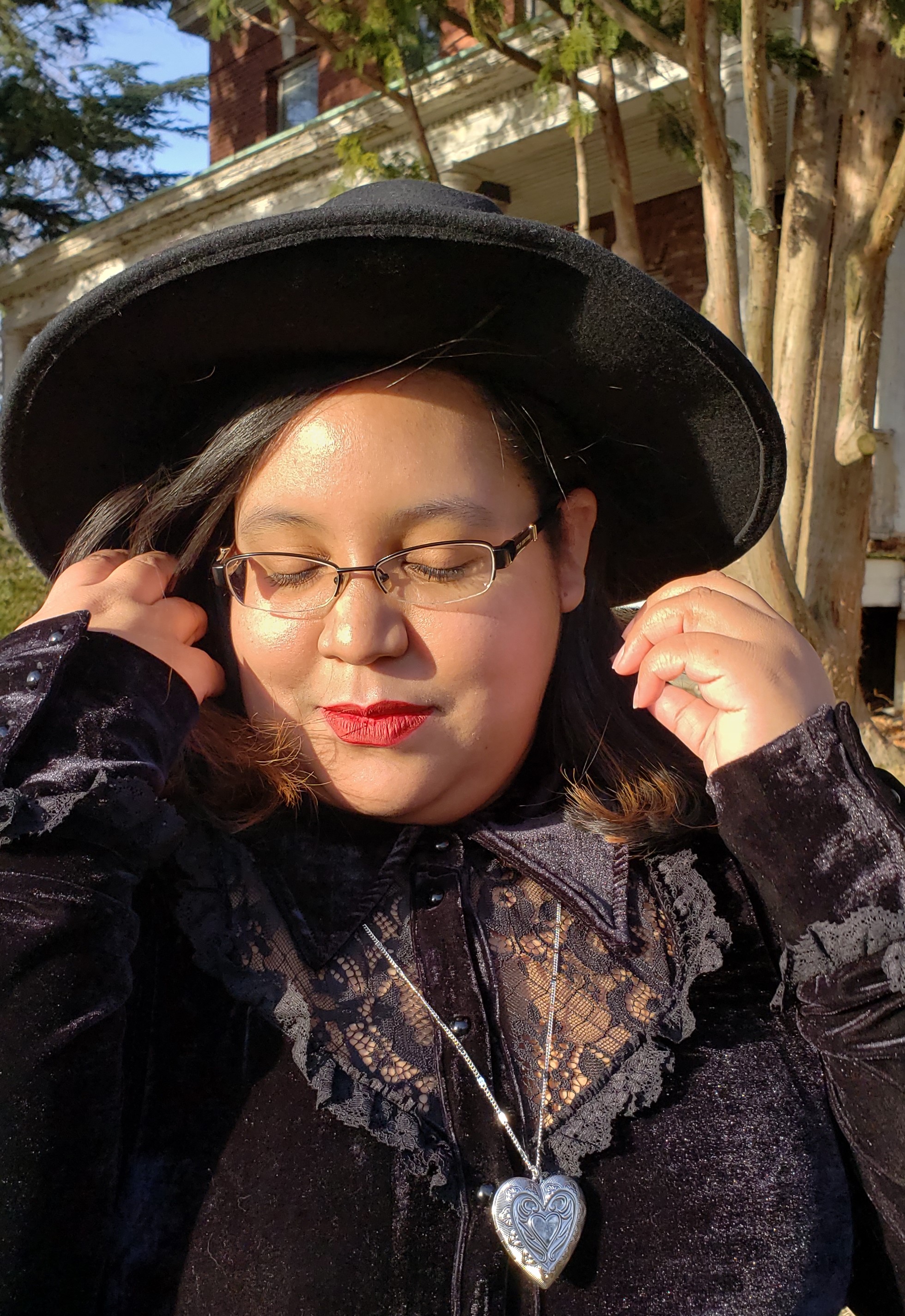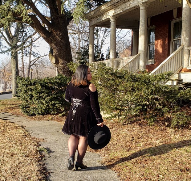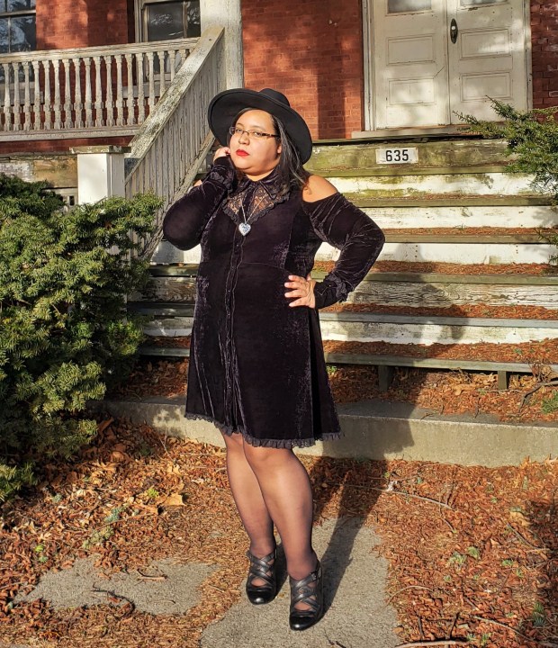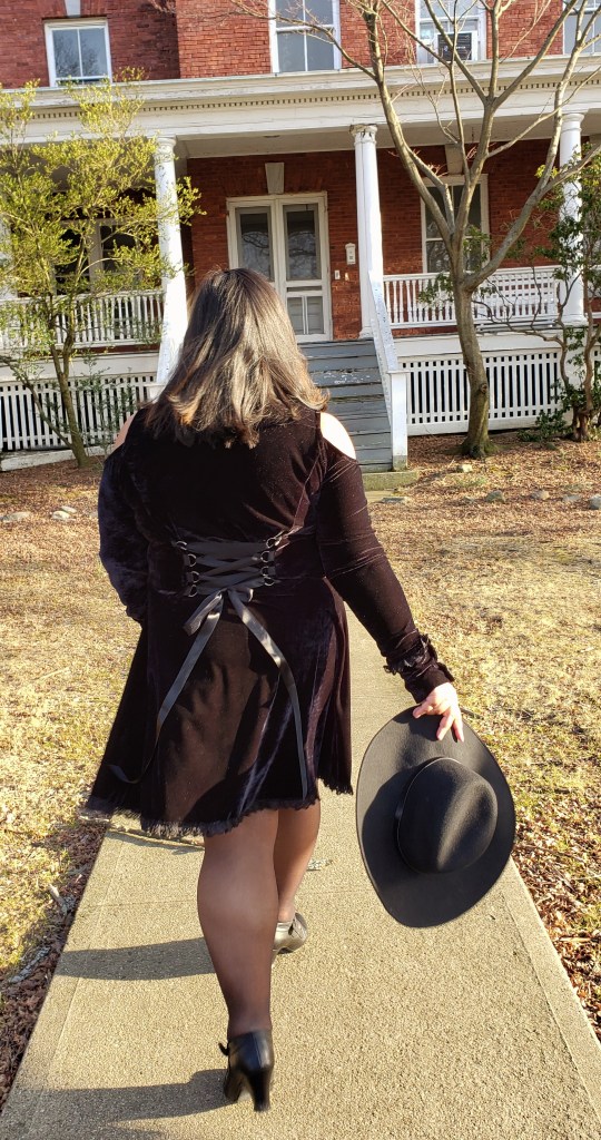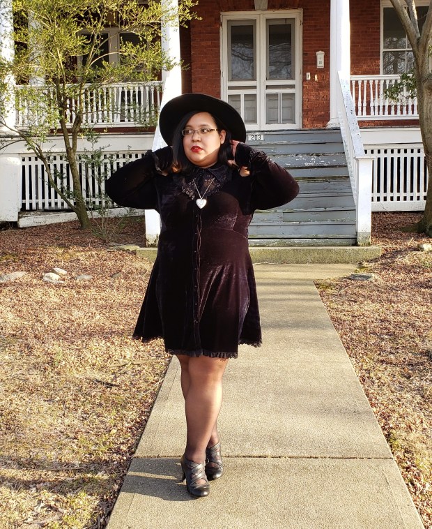 Aesthetically Valentine’s day could be considered to be the direct opposite of Halloween, yet if you were to look at the origins of this particular holiday you’d find that it actually has a lot more in common with Halloween than you’d think. So you can understand how easy it was for me to ditch the traditional V-day aesthetic of cutesy red, hearts and flowers for black hearts, skulls and blood red roses this year. I took this as a chance to style a Victorian goth look for the day. Of course goth style is not very affordable but I figured I should treat myself. After all, Valentine’s day is a holiday set aside for love so why not celebrate my love for myself by splurging on something stylish and elegant, right? Also I find nothing more romantic than textures that remind me of a different time like lace and velvet – both of which come together really well with this soft velvet shirt dress.