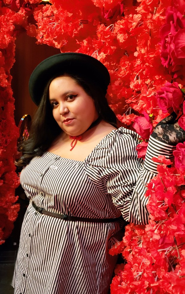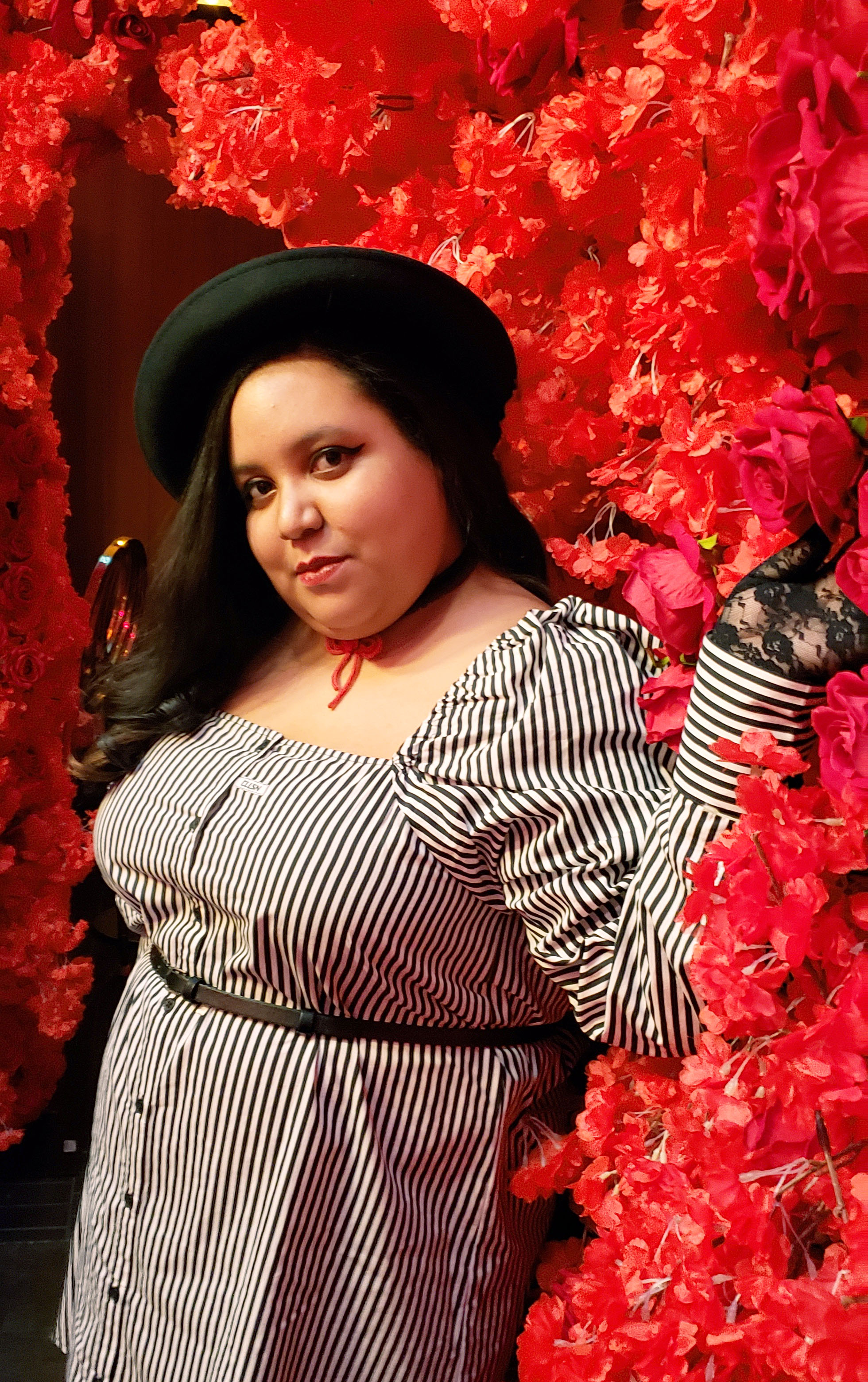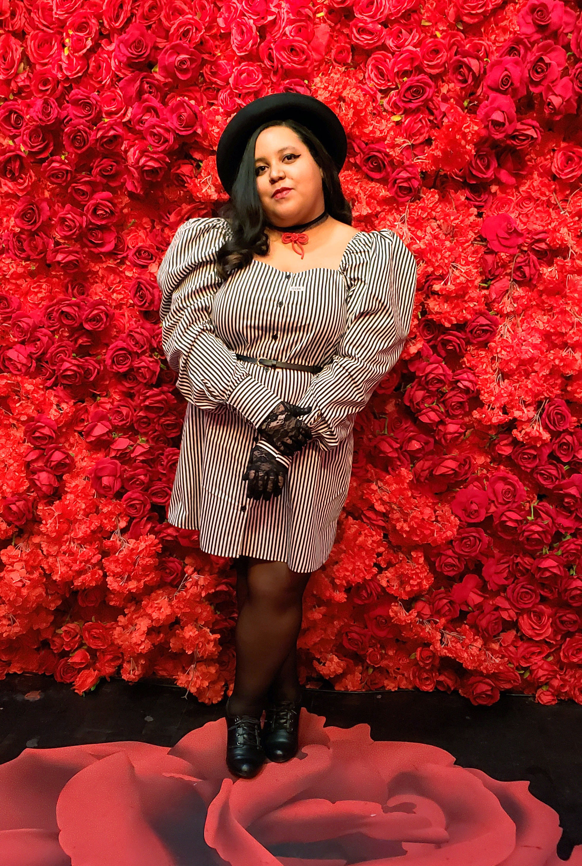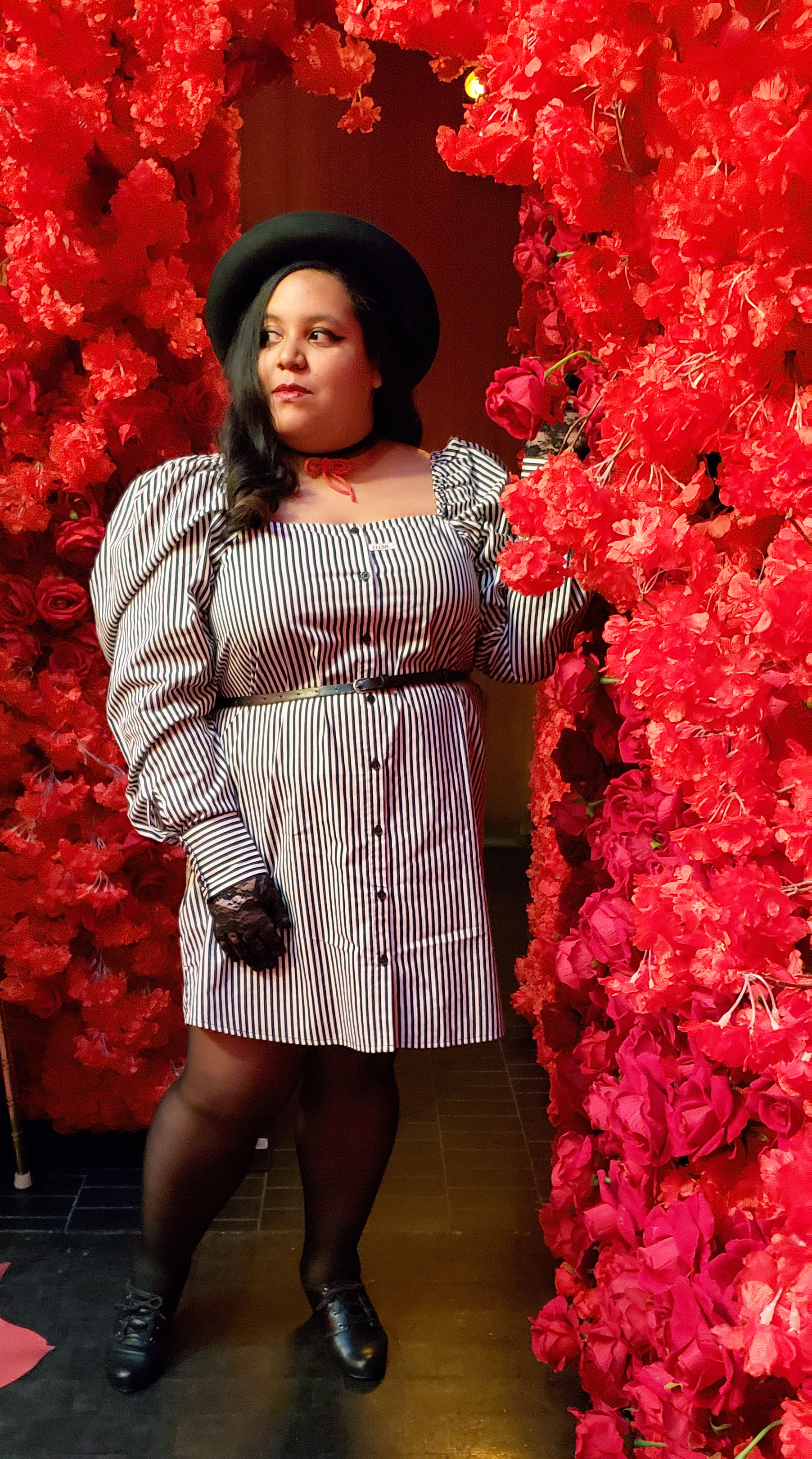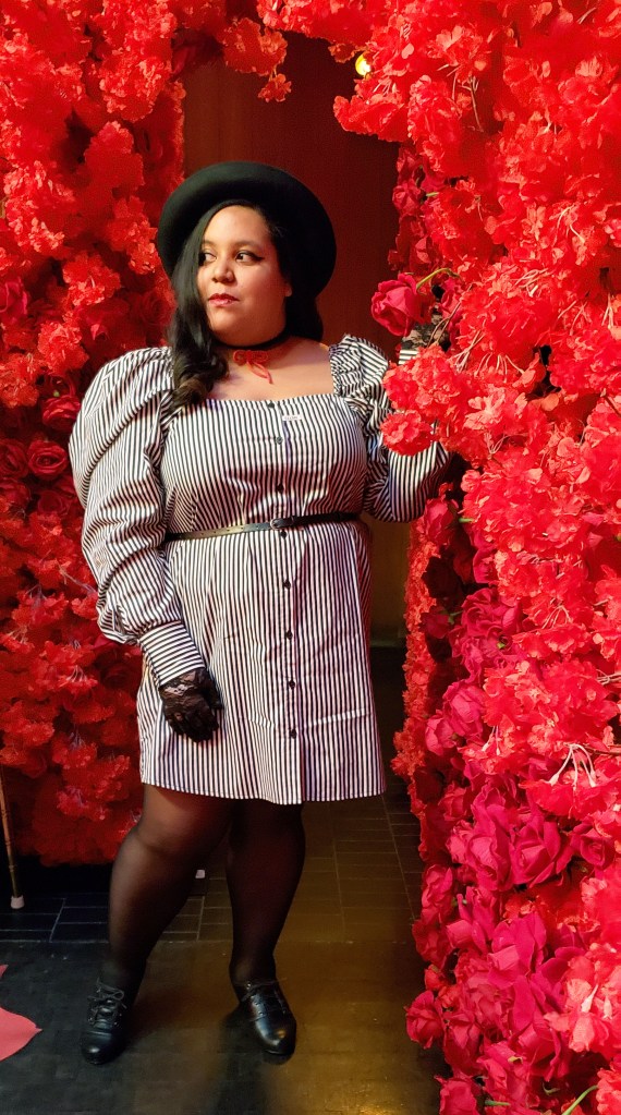 Of course styling an outfit inspired by a literal queen basically calls for some drama that lends itself for some sophistication. So with that in mind, I figured why not just go for some extravagant sleeves? I’m sure that I’m not the only one that has been told that being plus size means that I shouldn’t wear puff sleeves because it makes us look bigger and boxy a.k.a. “not flattering.” But fashion rules were made to be broken so I totally ignored that thought and went along with this this black and white stripe puff sleeve dress. I decided to wear the dress backwards to have the buttons face the front as it adds some more interest than the plain front and its elastic neckline. Cinched with a thin black belt, the sleeves became more pronounced, just like I had hoped, and I toped everything up with my new Scala hat, my lace gloves and a choker. I think all together I managed to hit some major Persephone-vibes.