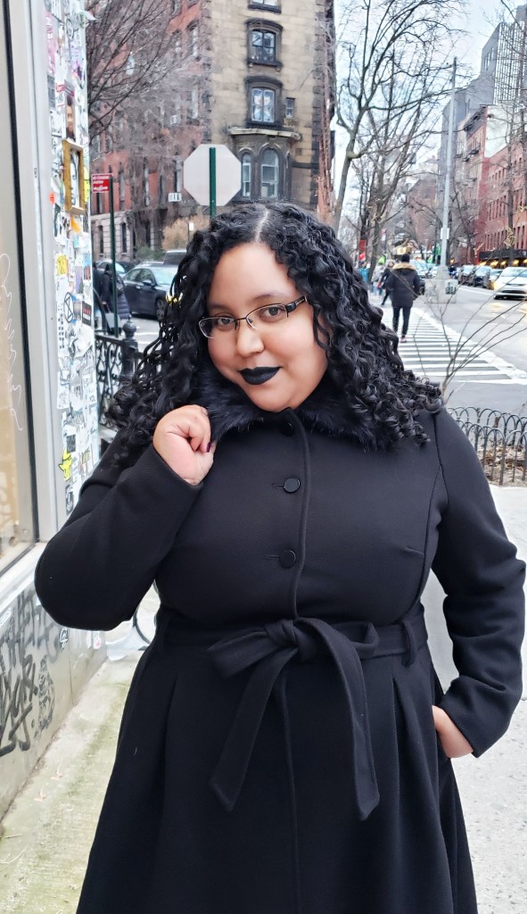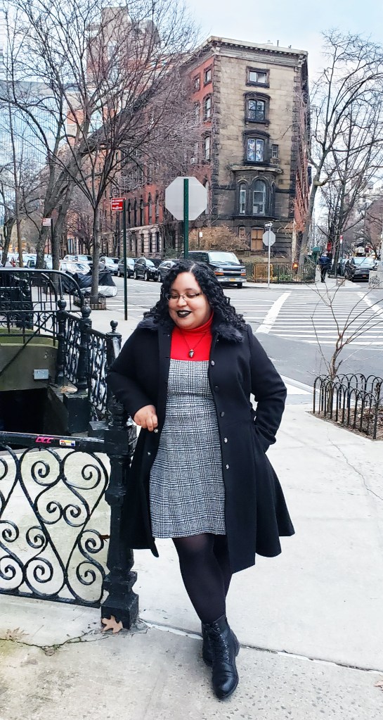 I got so many compliments for this coat though I can’t help but wonder if it was also the way I styled it . I tend to treat outerwear as an extension of my outfit, almost like an outer-layer for the “main event” (hahaha), and for this coat I figured a monochromatic look with a pop of color would be the best way to make it stand out even more. Now in the age of Instagram, it’s become almost taboo to repeat outfits, but I say wear what you love as many times as you want and if you want to change it up a bit, maybe play with a coat or jacket. For example, combined with this coat, the plaid dress, and turtleneck outfit is totally different from the first time I styled this dress. In this case I swapped the black turtleneck for a red one, went with combat booties instead of the over-the-knee boots, added my favorite onyx necklace and applied a black lipstick for some vamp goth fun.