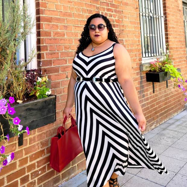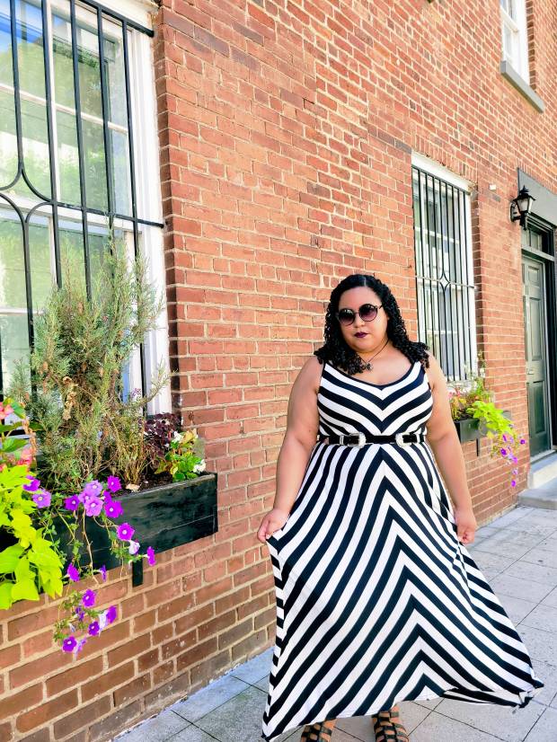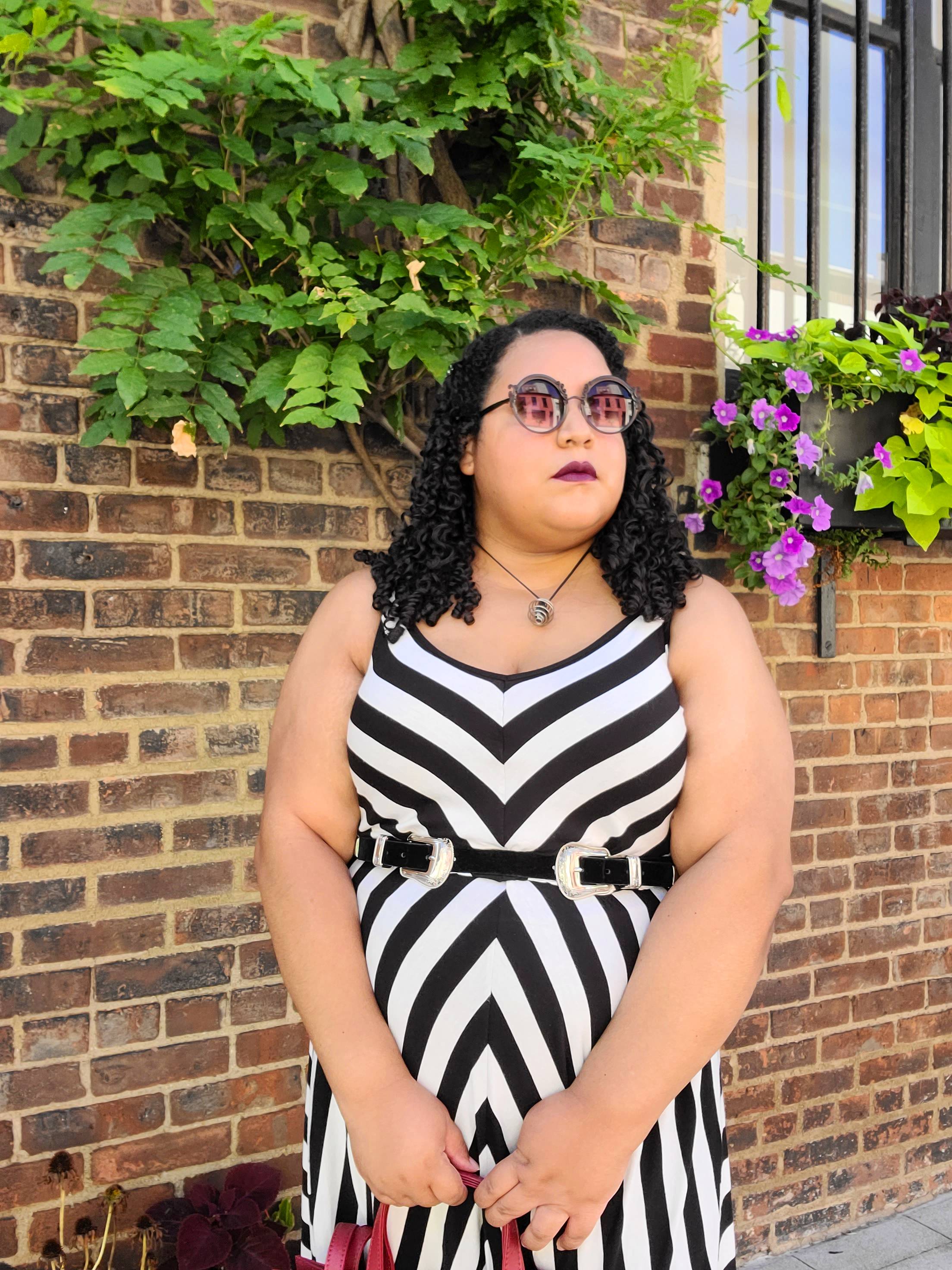 Sure this dress is not directly related to Beetlejuice as in that it is not a piece from any of the many film inspired collections that are currently available, but the monochromatic lines of this dress have always reminds me of it. This is actually a work sample of a dress design that I don’t believe they ended up buying, and what’s interesting is that while this had a hi-lo silhouette the “low” part was at the front for some reason. I ended up asking my mother to fix this for me as the fabric is a lot more slinky than I am used to working with on my own. Not only did she even out the hem but she added her own twist by following the direction of the stripes at the front to give this a shark-bite hem – something that I haven’t seen in a maxi dress, let alone one in plus size.