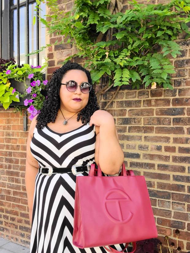 I tucked in some of the front into the elastic waist get more of an asymmetrical/hi-lo look as I knew I would be spending the day walking and taking mass transit which doesn’t tend to work well with a maxi dress when you’re petite like me. I used this double buckle belt to hide the tuck and it also worked well to give my waist some more definition. I added a pop of color with my new oxblood Telfar bag that actually went well with the ombre color of my new favorite sunglasses.