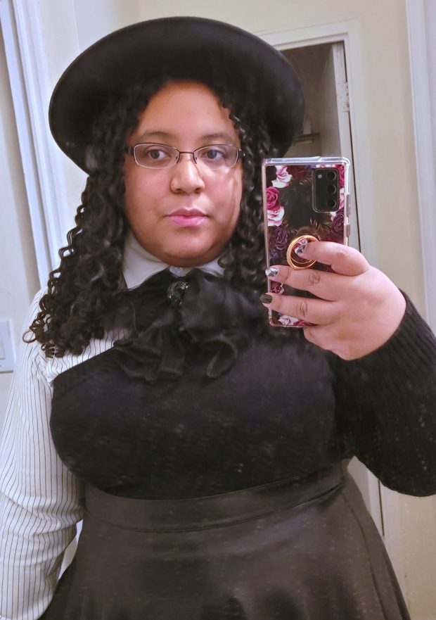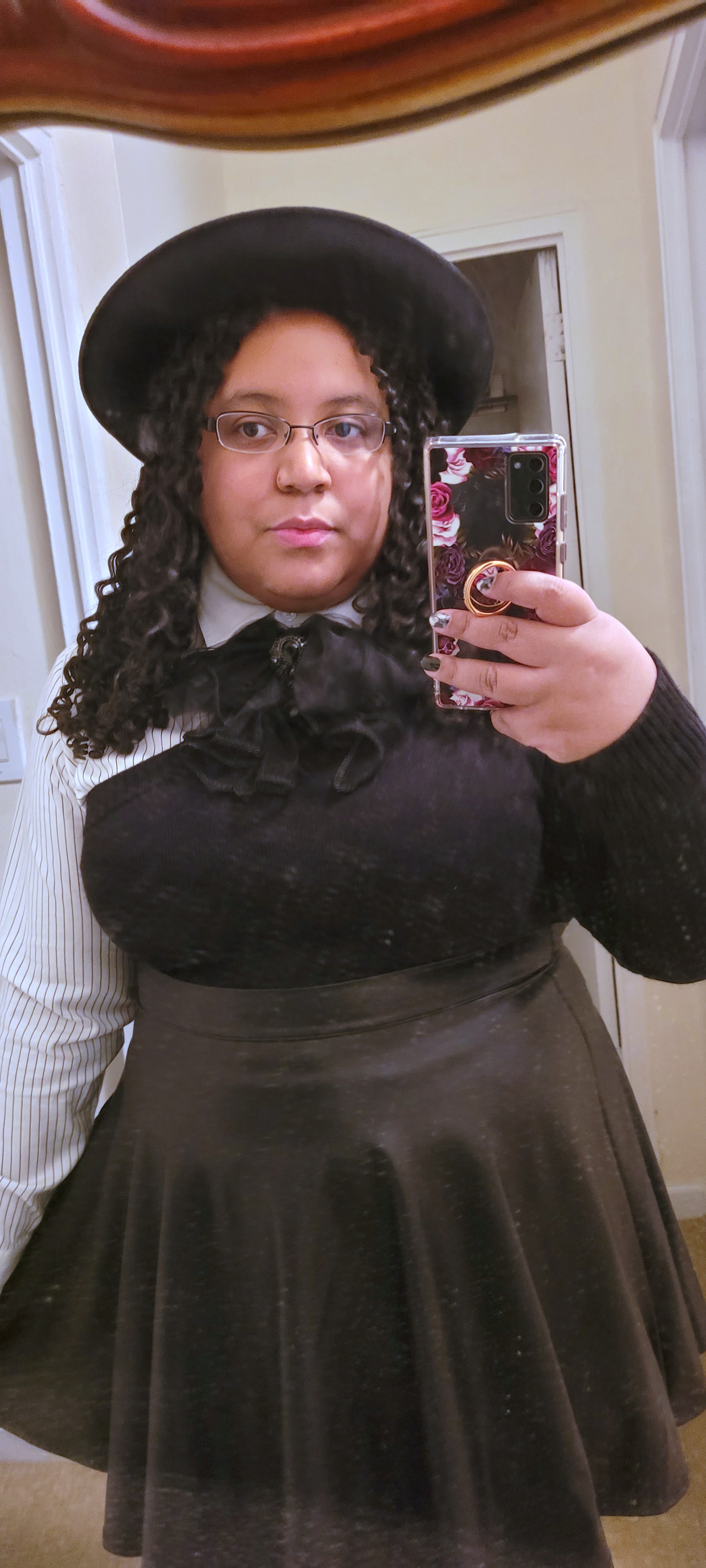 As the collar is solid I figured it would work well with these bat collar pins I recently bought to add a subtle nod to spooky season. While it did look as good as expected, given the bold contrast with my sleeves I thought the look just asked for something… more. So I decided to pair it with a faux leather skater skirt to play with the textures, as well as added a jabot and brooch for some elegance. I topped it off with my crown hat and suede platform creepers.