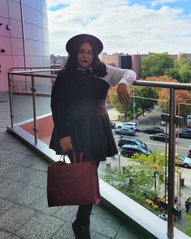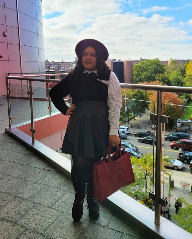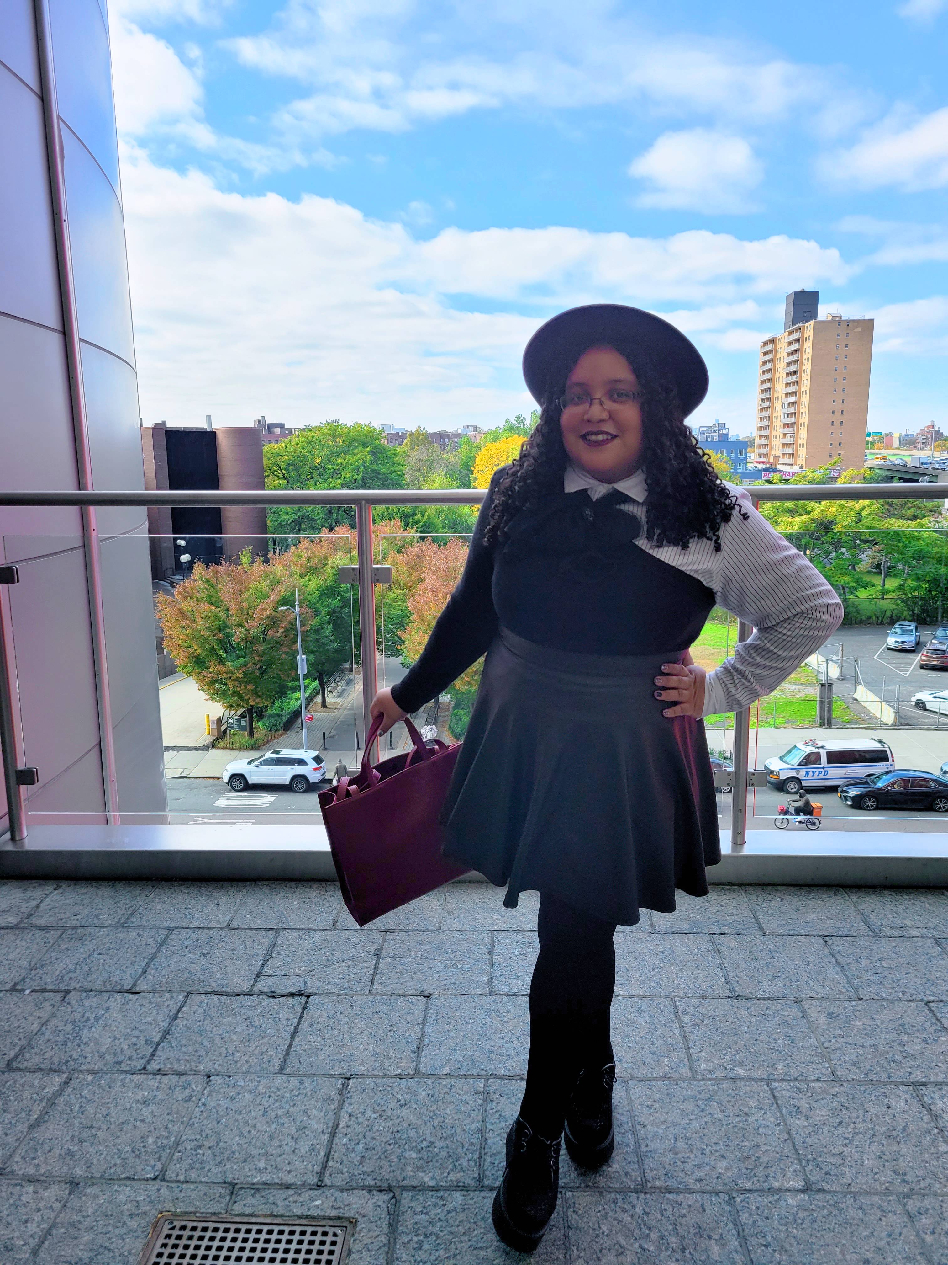 This is a corporate goth look that I would definitely consider wearing to a more traditional/conservative work place. The two tone style of it all gives me a bit of Cruella mixed with gothic school girl kind of vibes and I really love that. (Looking back, since I wore this outfit the day before Halloween, I should have added my fingerless faux leather gloves too, so that I would be more in Moira Rose territory. Next time for sure.)