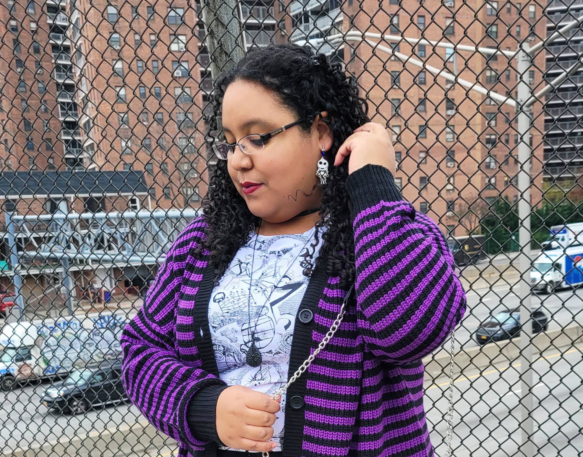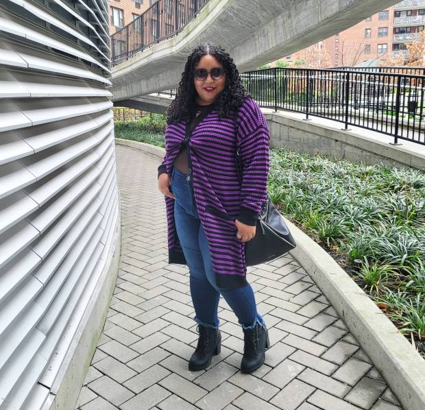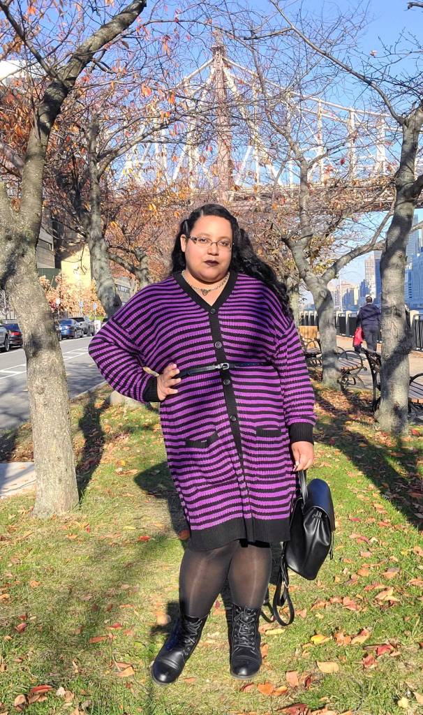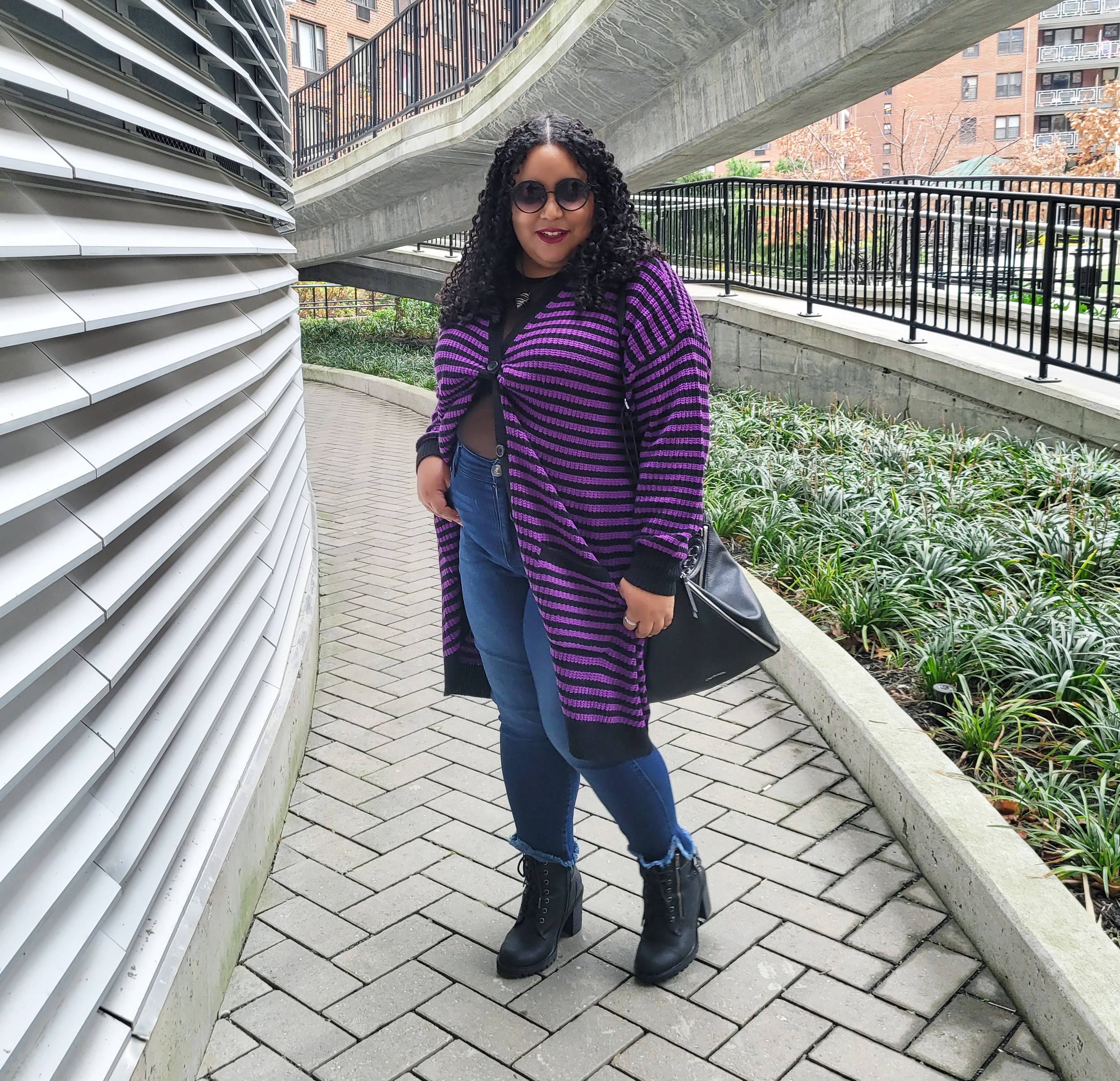 With its striking black and purple stripes this cardigan just screams “alternative style,” so I knew that I simply had to incorporate a graphic or band tee. It being the holiday season, I ultimately decided to go with my new PlusHii Kawaii Nightmare Before Christmas graphic crop tee.