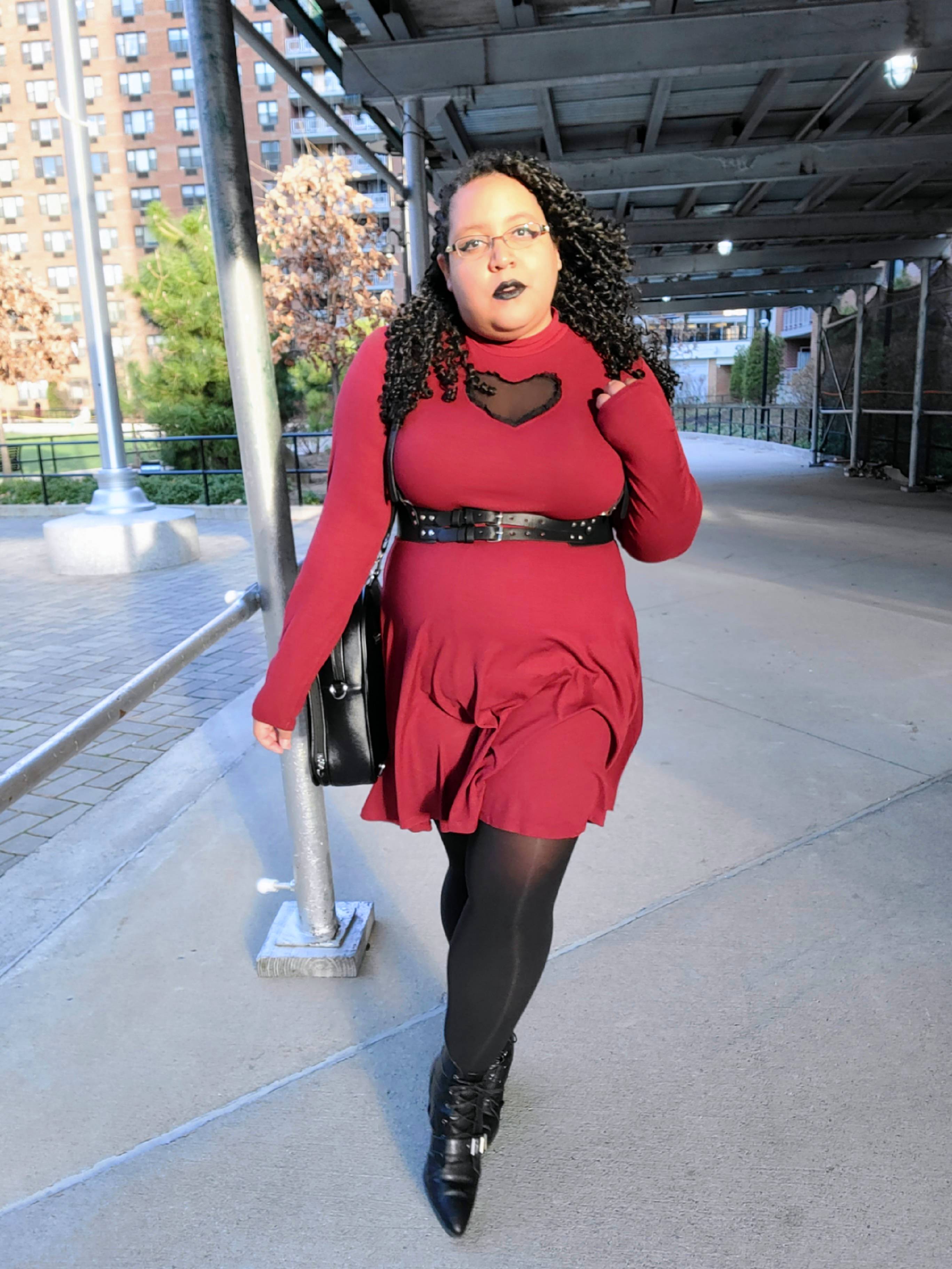 Funny enough, this is also the first year I actually have plans on Galentine’s Day with my friends, so I decided to go through my closet yet again to look for themed outfit options. As our actual activities have yet to be discussed I settled on some more darker vibes simply because they have come to expect it from me at this point. (Don’t mind me, I’m just wearing all the things I would have loved when I was a teenager now as an adult.) This is a dress that I actually got and wore for Valentine’s Day 2020. It has since been made available in various other iterations on Hot Topic’s website in various colors including purple and black featuring a sheer crescent moon or star.