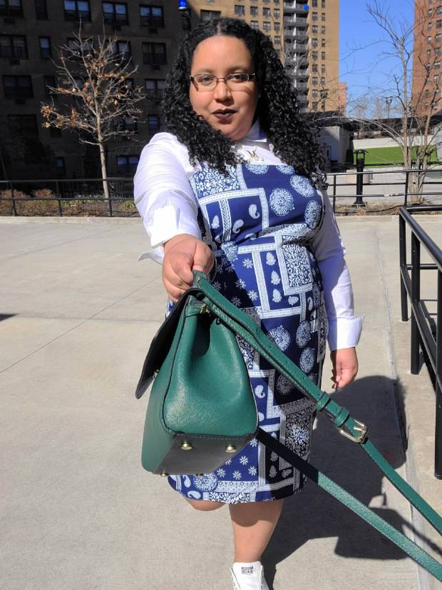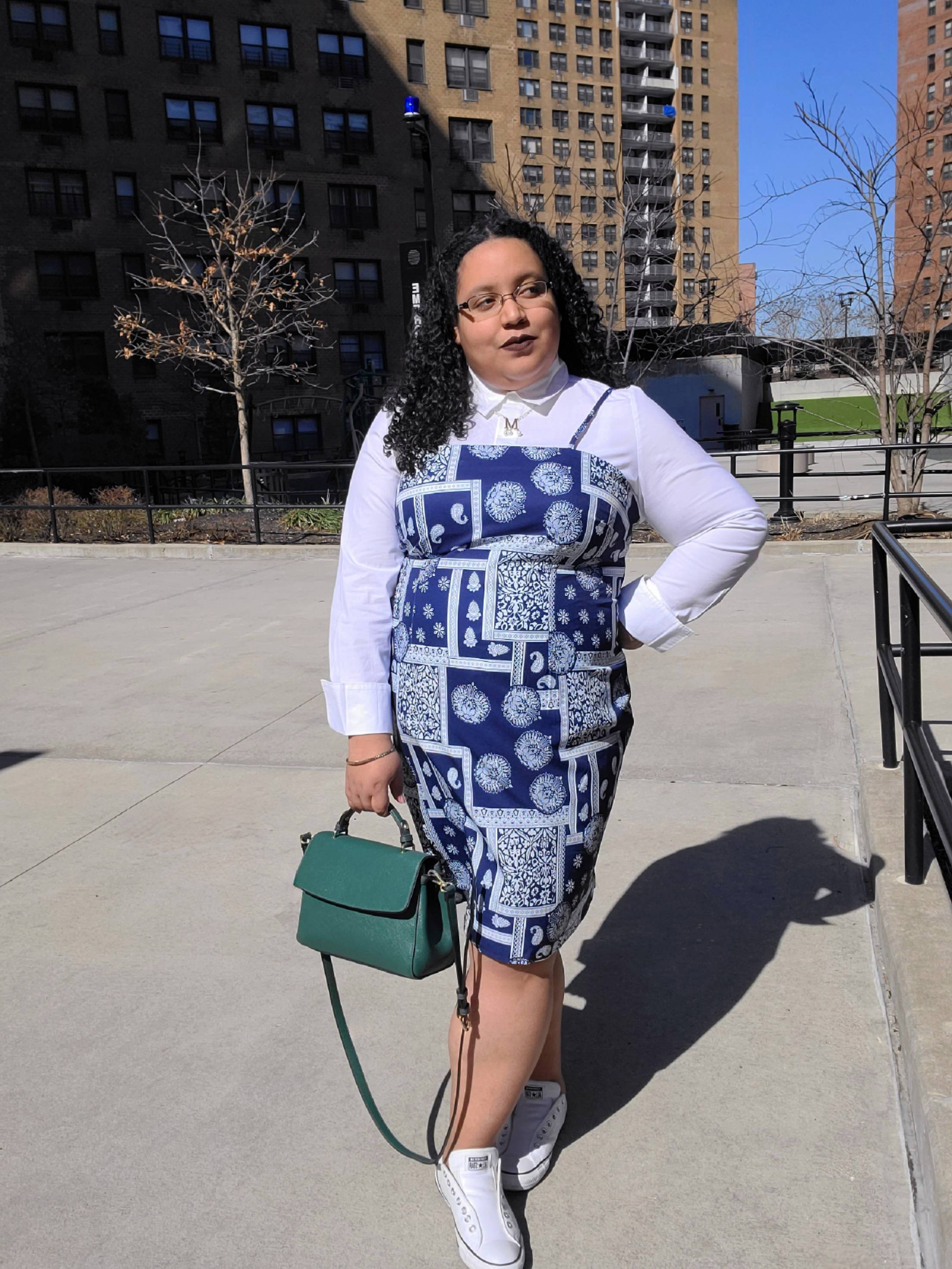 Due in part to my current job search, I have business casual styling stuck in my brain which is also the reason why I paired this dress with a basic white button down shirt in spite of it being a slinky bodycon. Overall it is a monochromatic look that worked well with this emerald green faux leather cross body bag as a pop of color. I find the overall palette of this look to be a refreshing take on spring colors though being bolder than the pastels which usually reigns supreme this time of year.