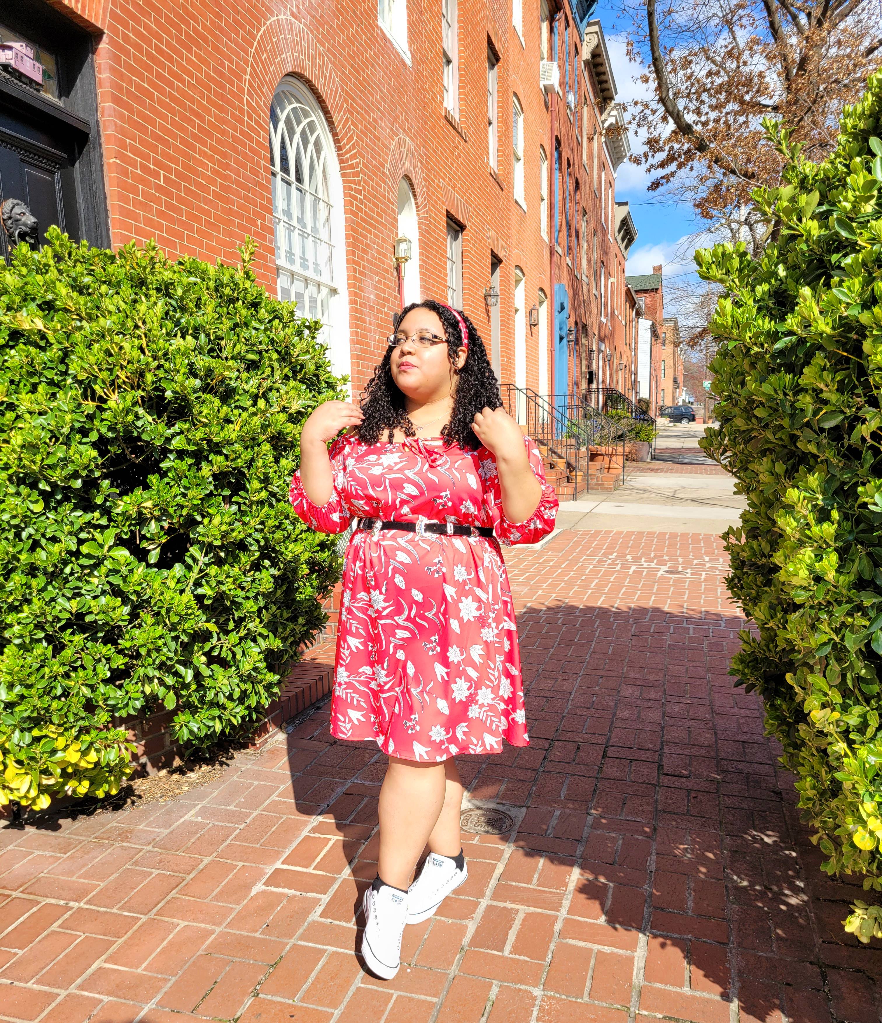 On it’s own, the dress has a basic A-line silhouette that easily becomes a fit-and-flare with the cinch of a belt. I actually took the belt that it comes with and tied it as a matching headband instead. The floral print is white yet outlined in black and so I added my black faux suede double buckle belt to make this truly pop.