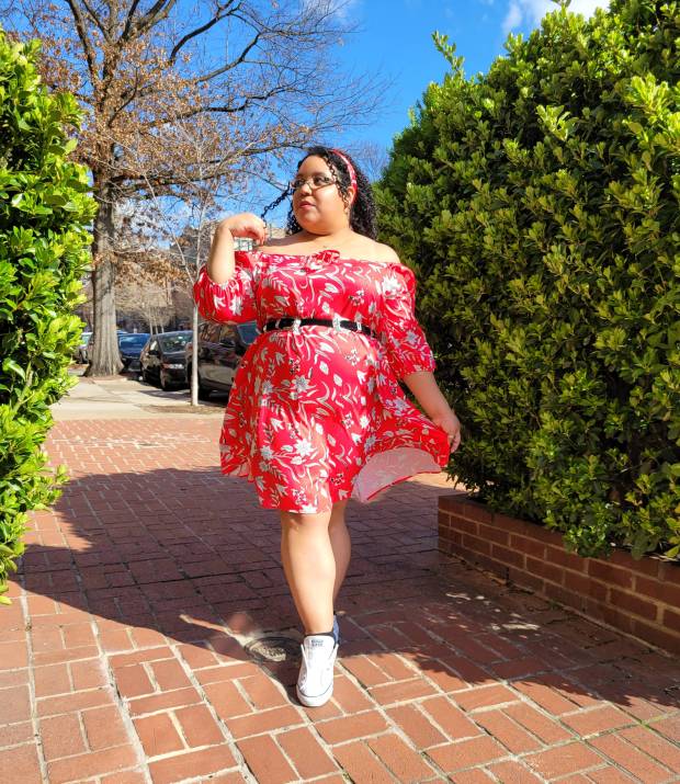 Ditsy Floral Ties Off Shoulder Dress (wearing a size 18/2X)