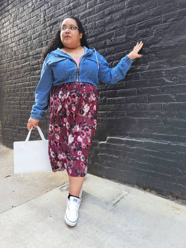 Originally I had plans of styling this jacket with the blue cami dress, but something about this style just gave me the sense that it needed to be paired with something with some more movement. So I went with this pleated cami dress that I got from shopping my best friend’s closet last summer. While the dress does have a floral print, the color palette of the lower skirt portion is on the darker side, so I went with adding some white assets with my slip-on converse sneakers and this faux leather tote to really bring on the spring vibes.