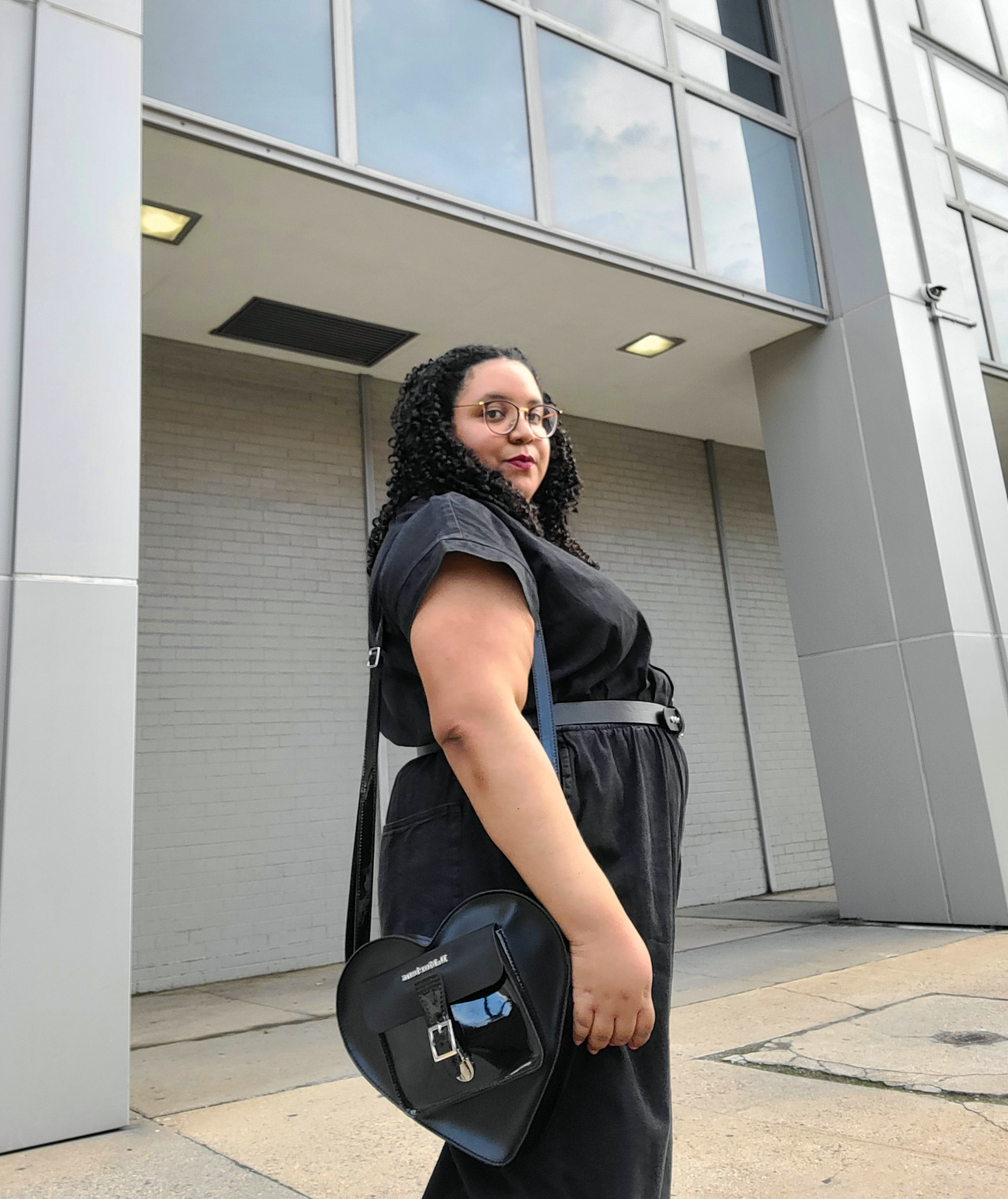 This jumpsuit actually comes with a matching denim tie belt, but I wanted to have some more structure as well as waist definition, so I swapped it for one of my own with hardware that matched the metal tone of the buttons. If it weren’t for the fact that the summer heat and humidity is starting to settle in, I would have gone with heeled boots, however I decided on my faux leather platform creepers to give me some height. The Doc Martens heart bag and my favorite choker pulled this simple corp goth look together fair beyond what I hoped and pictured in my head.